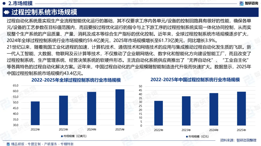 全球市场规模:过程自动化系统是实现生产全流程智能优化运行的基础。近年来,全球过程控制系统市场规模逐步扩大,2024年全球过程控制系统行业市场规模约59.4亿美元,2025年市场规模增长至61.73亿美元,同比增长3.9%。