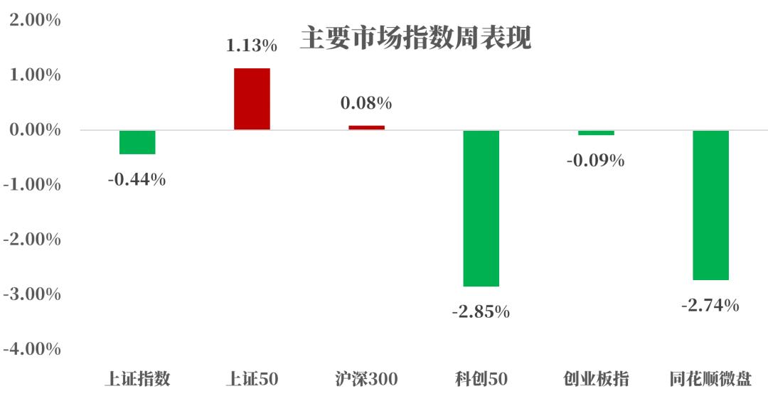 上周,A股主要指数行情涨跌不一,市场成交活跃度有所回升。上证指数下跌0.44%,市场向价值风格倾斜,避险情绪有所升温,上证50上涨1.13%,沪深300上涨0.08%;科创板块追涨情绪明显降温,科创50回撤2.85%,创业板指略有回落,跌幅为0.09%;小微盘同样承压较多,下跌2.74%。