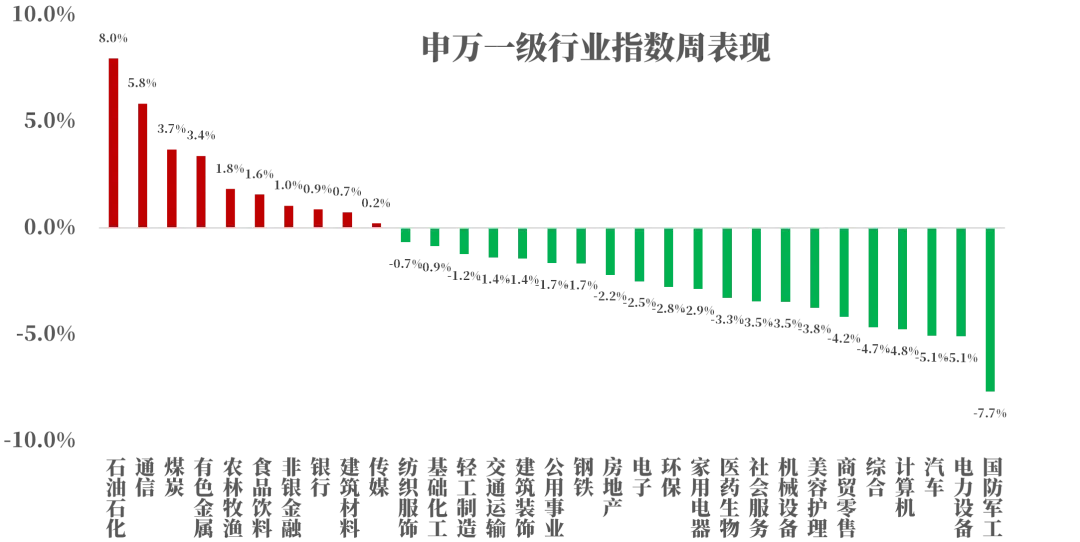 上周行业板块表现显著分化,资源类板块领涨:石油石化(+8.0%)、煤炭(+3.7%)、有色金属(+3.4%),通信板块切换上行(+5.8%),权重板块止跌回升:食品饮料(+1.6%)、非银金融(+1.0%)、银行(+0.9%),下跌较多的板块:国防军工(-7.7%)、电力设备(-5.1%)、汽车(-5.1%)。