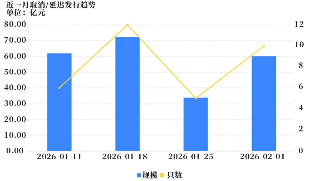 取消发行的债券共10只,累计取消发行60.15亿元,环比有所上行。近一个月共有33只信用债取消发行或者延迟发行,累计取消发行228.12亿元,最新统计如下: