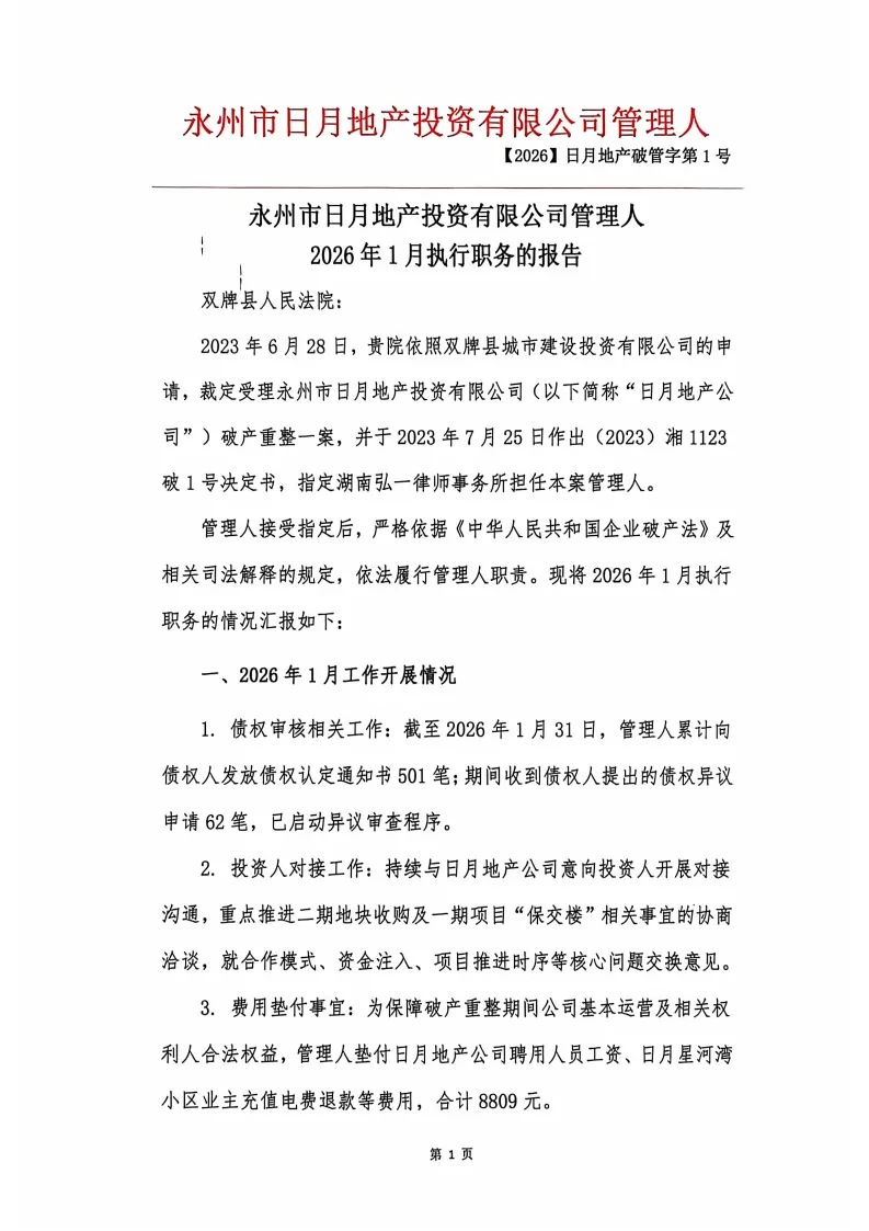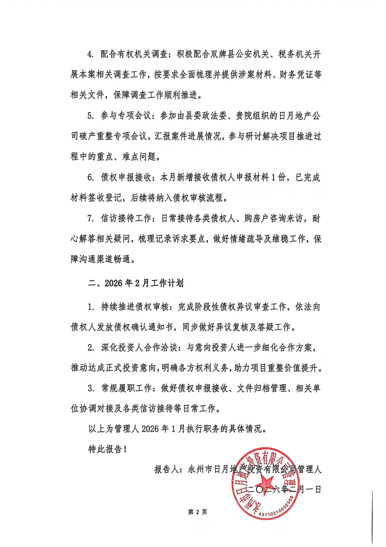 永州市日月地产投资有限公司管理人2026年1月执行职务的报告
