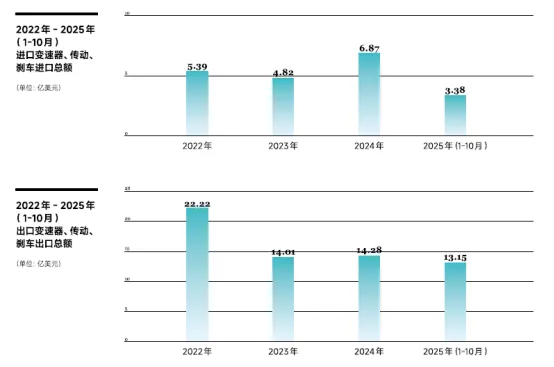 2、高端零部件国产替代加速:2025年1-10月,变速器、传动、刹车等关键零部件出口额同比增长14.9%,而进口额同比下降43%,贸易顺差持续扩大。