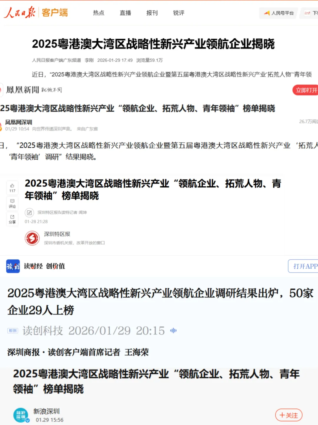 近日,由深圳战新会牵头组织的“2025粤港澳大湾区战略性新兴产业领航企业暨第五届粤港澳大湾区战略性新兴产业‘拓荒人物’‘青年领袖’调研”结果正式发布。本次评选结果由人民日报、深圳特区报、深圳商报、凤凰网、新浪等多家主流媒体客户端转载报道,累计浏览量突破百万,引发广泛关注。点击查看完整榜单: