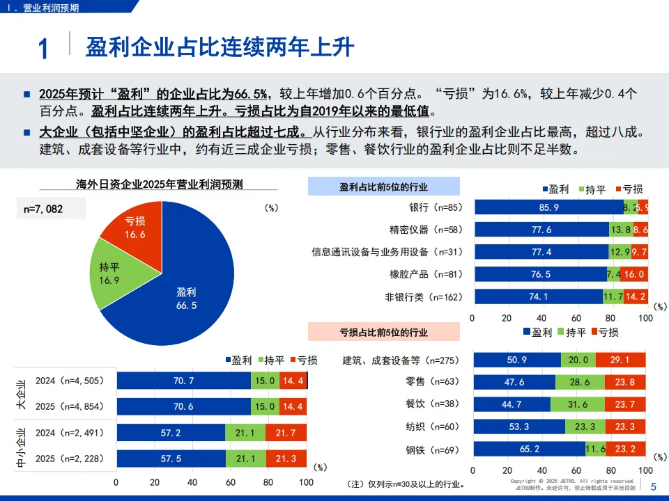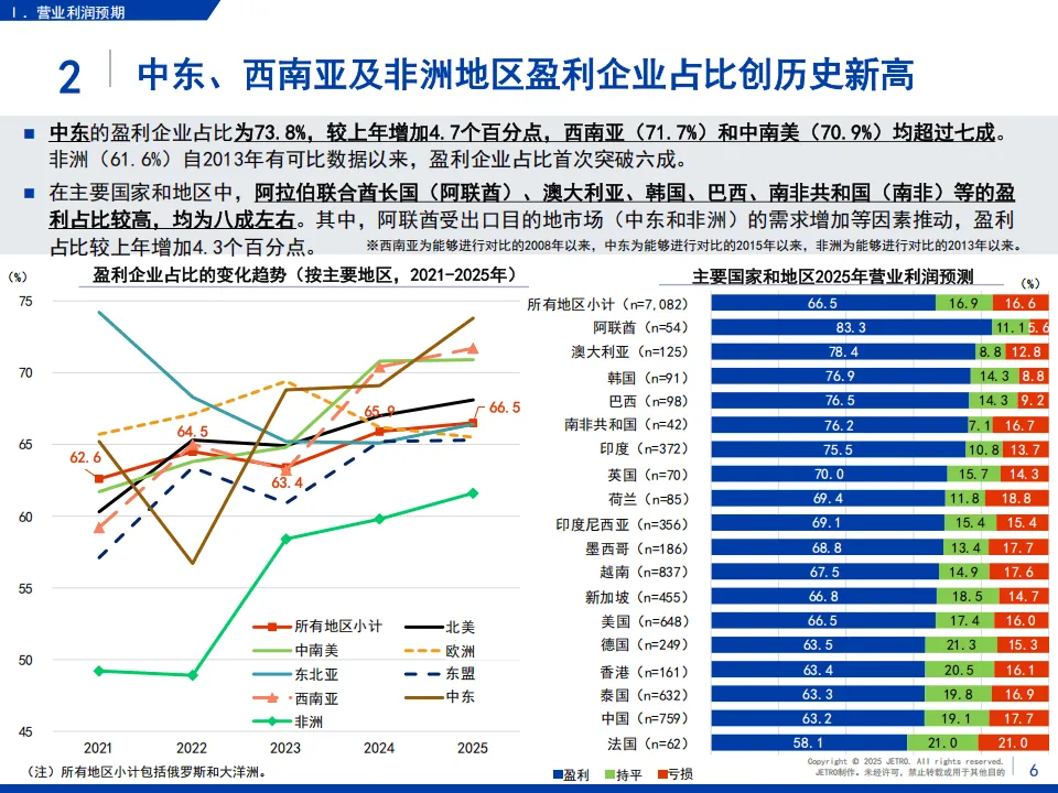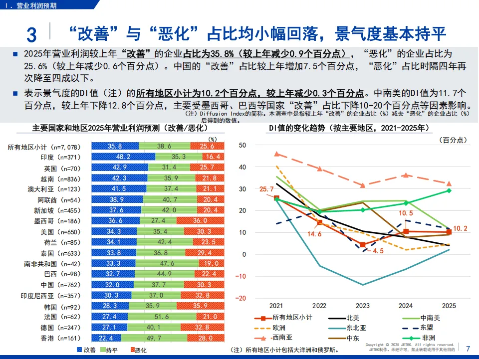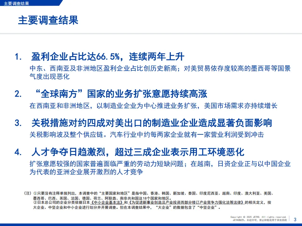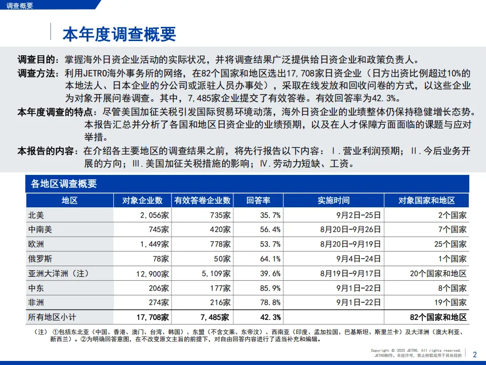 日本贸易振兴机构(JETRO)2025年度海外日资企业实况调查覆盖82个国家和地区的17708家企业,有效回收率42.3%。调查显示,尽管国际贸易环境动荡,海外日资企业整体业绩稳健增长,同时面临关税冲击、劳动力短缺等多重挑战,业务布局呈现向“全球南方”倾斜的趋势。