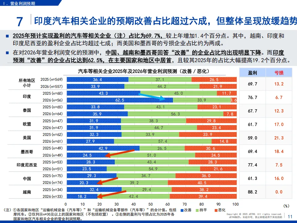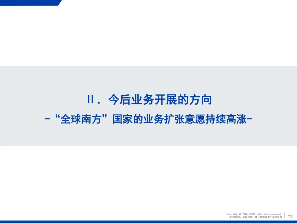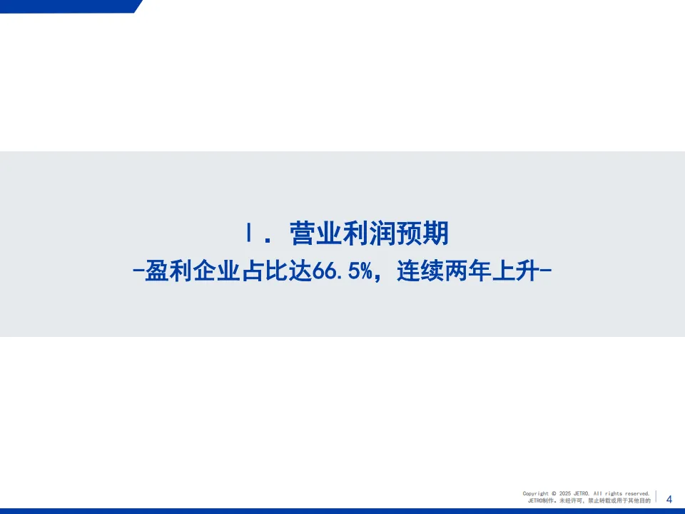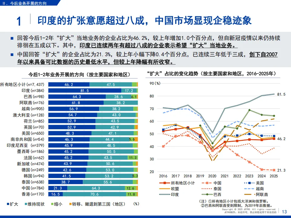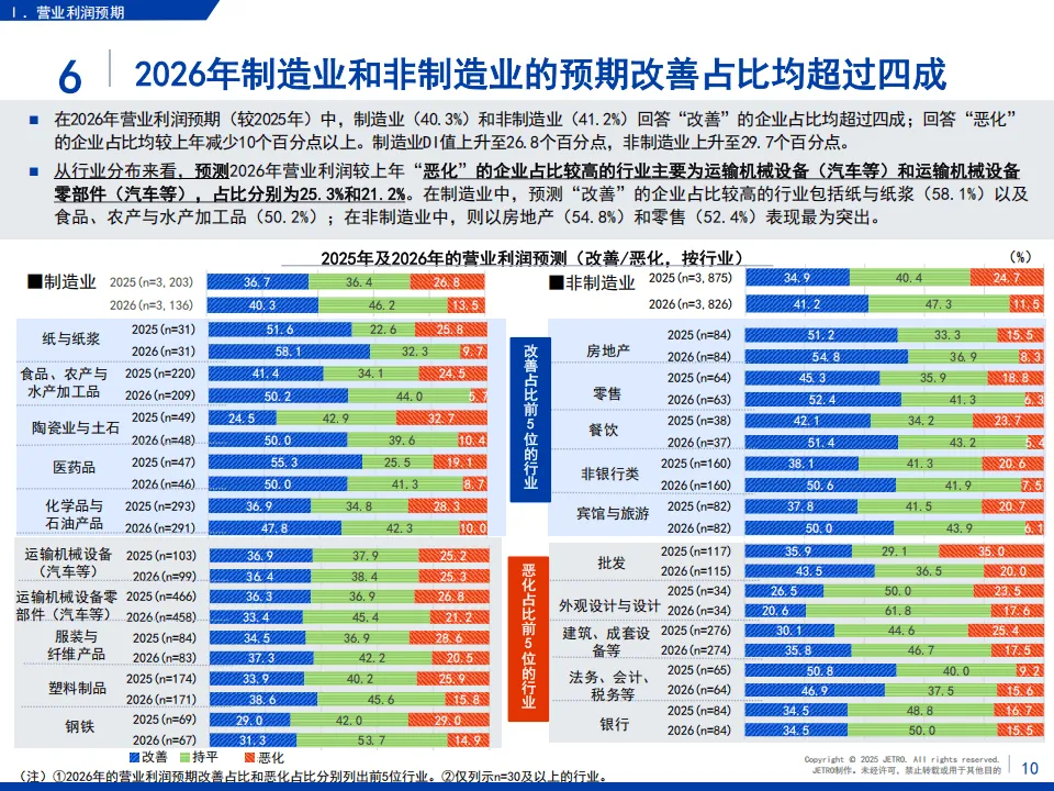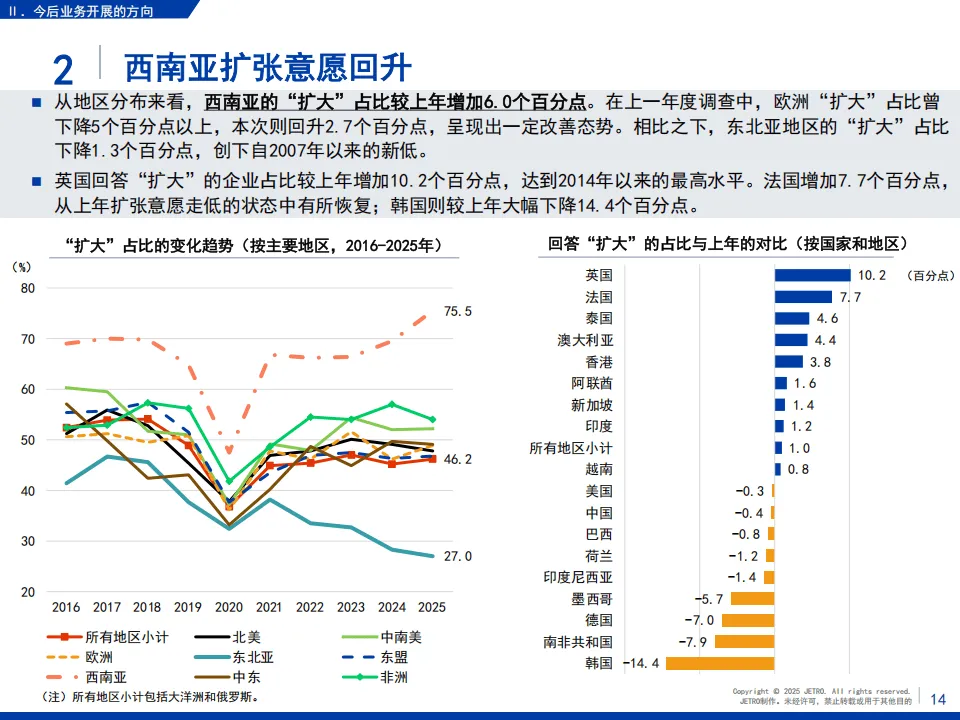 日本贸易振兴机构(JETRO)2025年度海外日资企业实况调查覆盖82个国家和地区的17708家企业,有效回收率42.3%。调查显示,尽管国际贸易环境动荡,海外日资企业整体业绩稳健增长,同时面临关税冲击、劳动力短缺等多重挑战,业务布局呈现向“全球南方”倾斜的趋势。