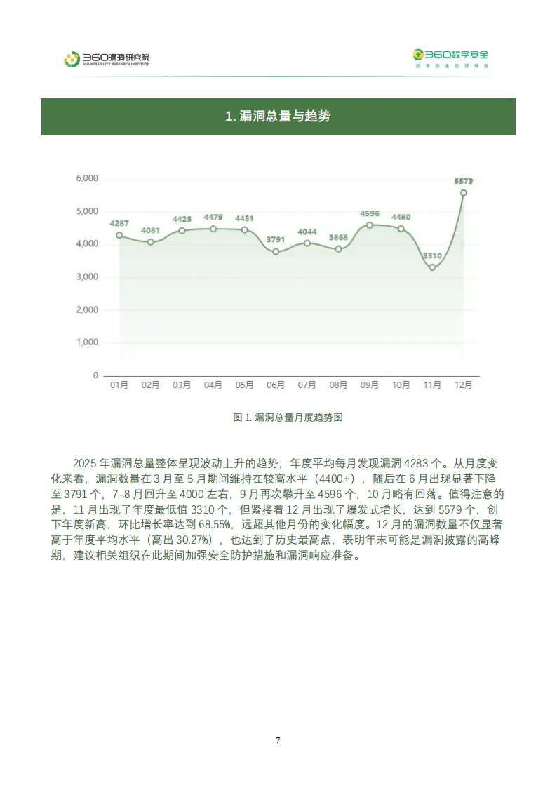 《2025年度网络安全漏洞分析报告》全面呈现了该年度全球网络安全领域的严峻态势与深刻变革。2025年漏洞总量呈波动上升趋势,年度平均每月发现漏洞4283个,12月以5579个创年度新高,环比增长率达68.55%。漏洞严重程度上,中危漏洞占比46.29%,高危漏洞占34.82%,二者合计占比超八成,构成主要风险来源。
