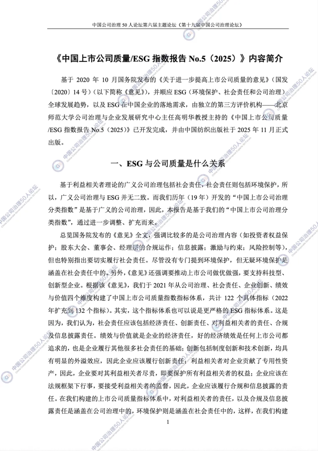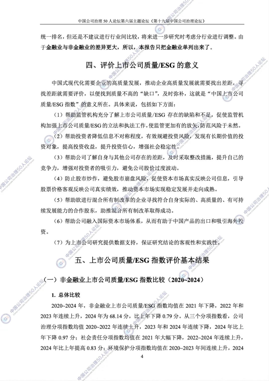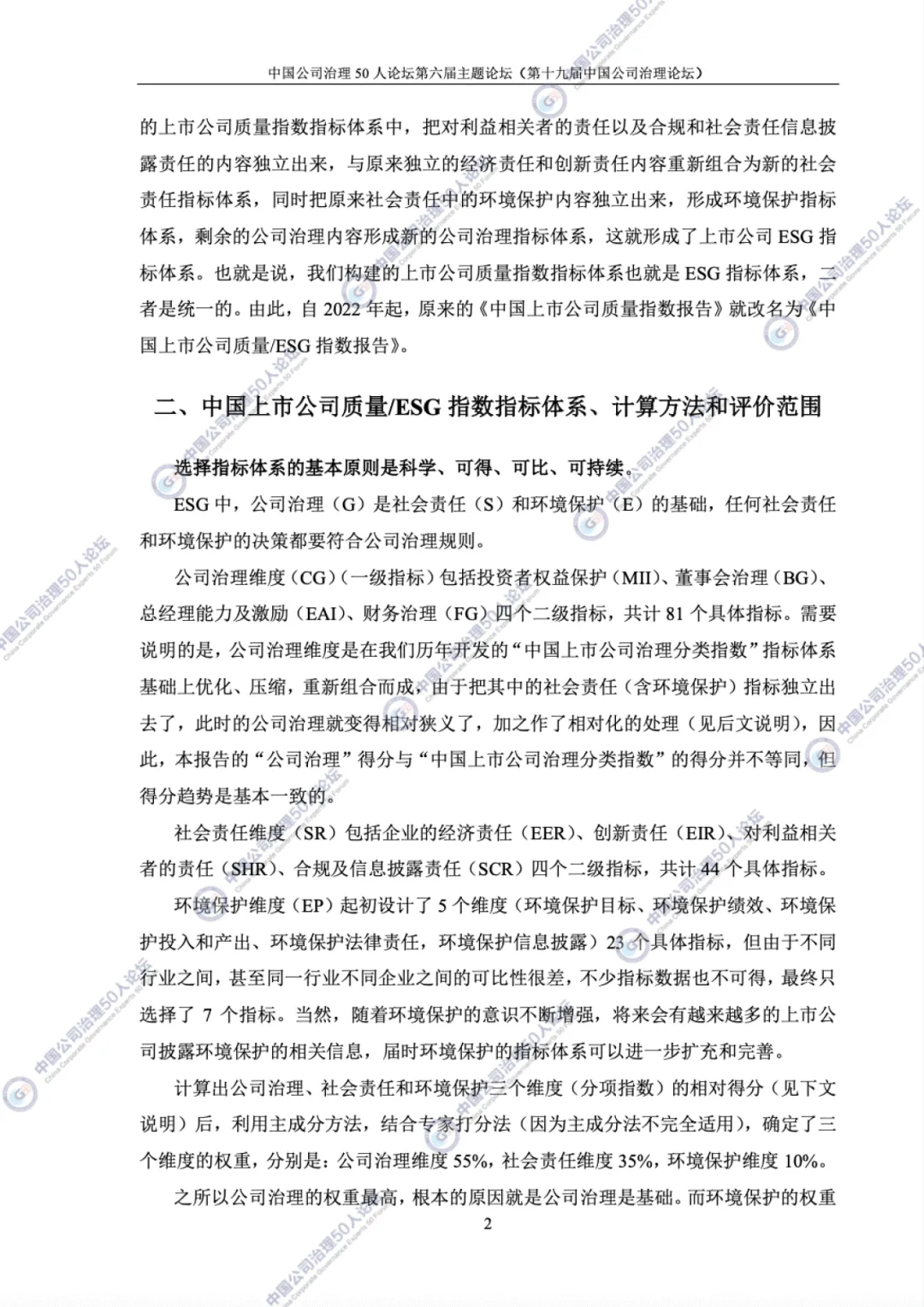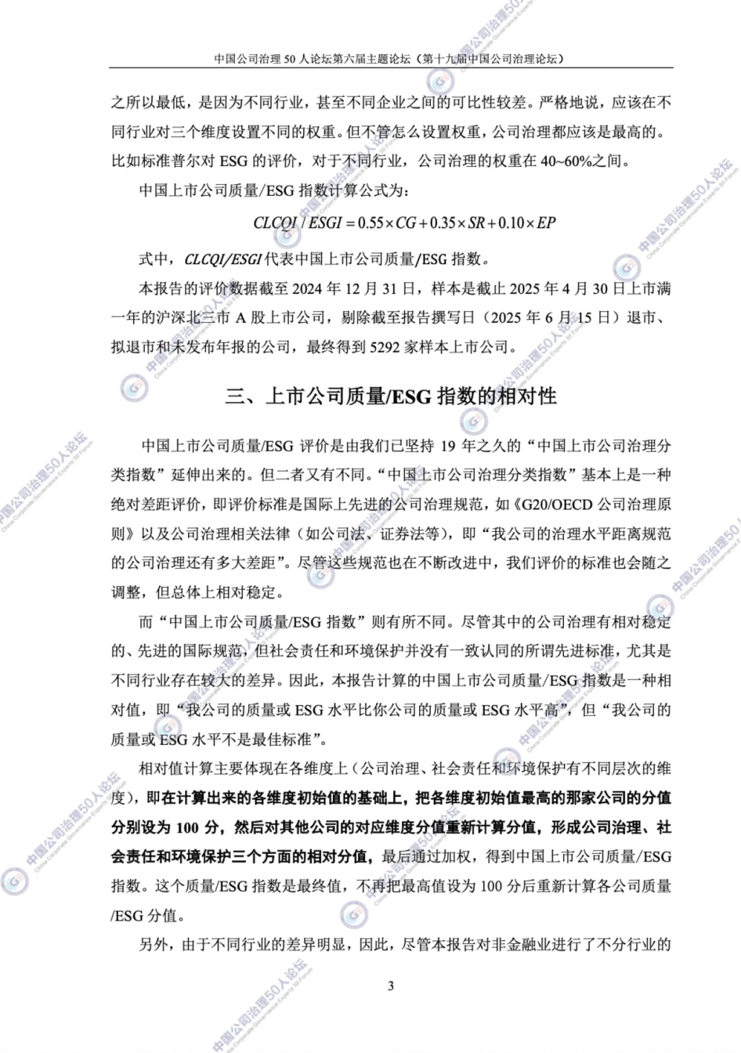报告明确,广义公司治理与 ESG 内涵一致,上市公司质量指数指标体系与 ESG 指标体系相统一,2022 年起相关报告正式更名。指标体系遵循科学、可得、可比、可持续原则,涵盖公司治理(81 个指标,权重 55%)、社会责任(44 个指标,权重 35%)、环境保护(7 个指标,权重 10%)三大维度,评价范围为截至 2025 年 4 月 30 日上市满一年的 5292 家沪深北三市 A 股上市公司。该指数为相对值评价,不建议跨行业比较,金融业单独列示。