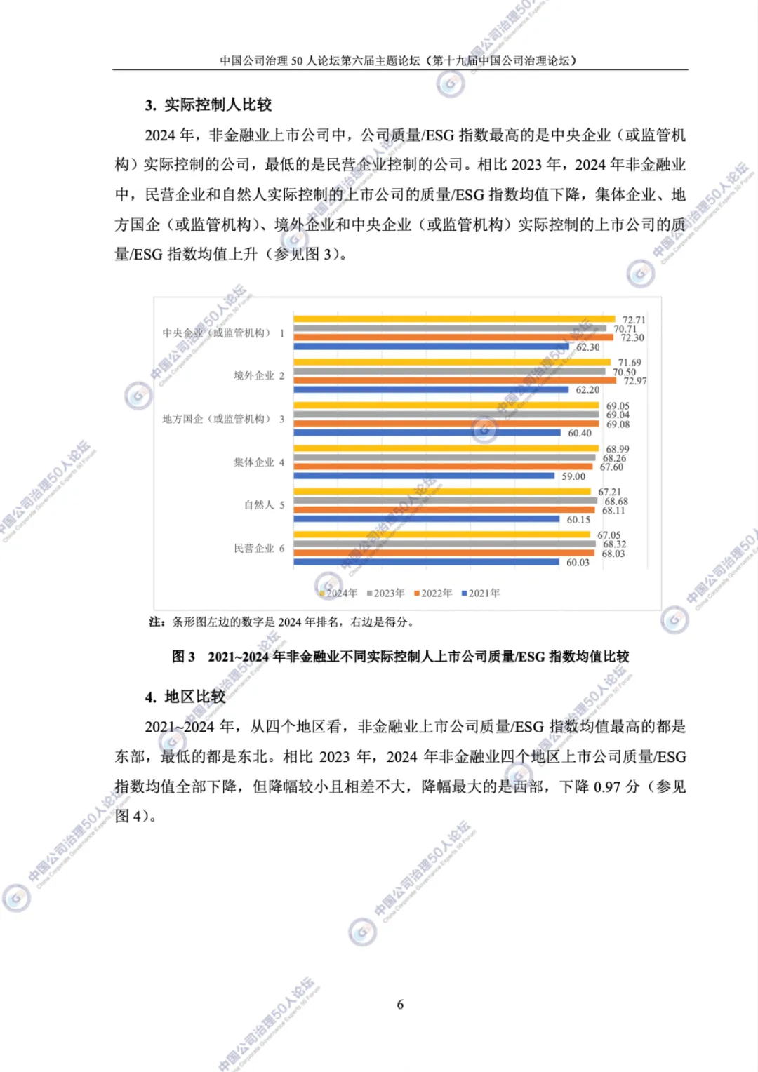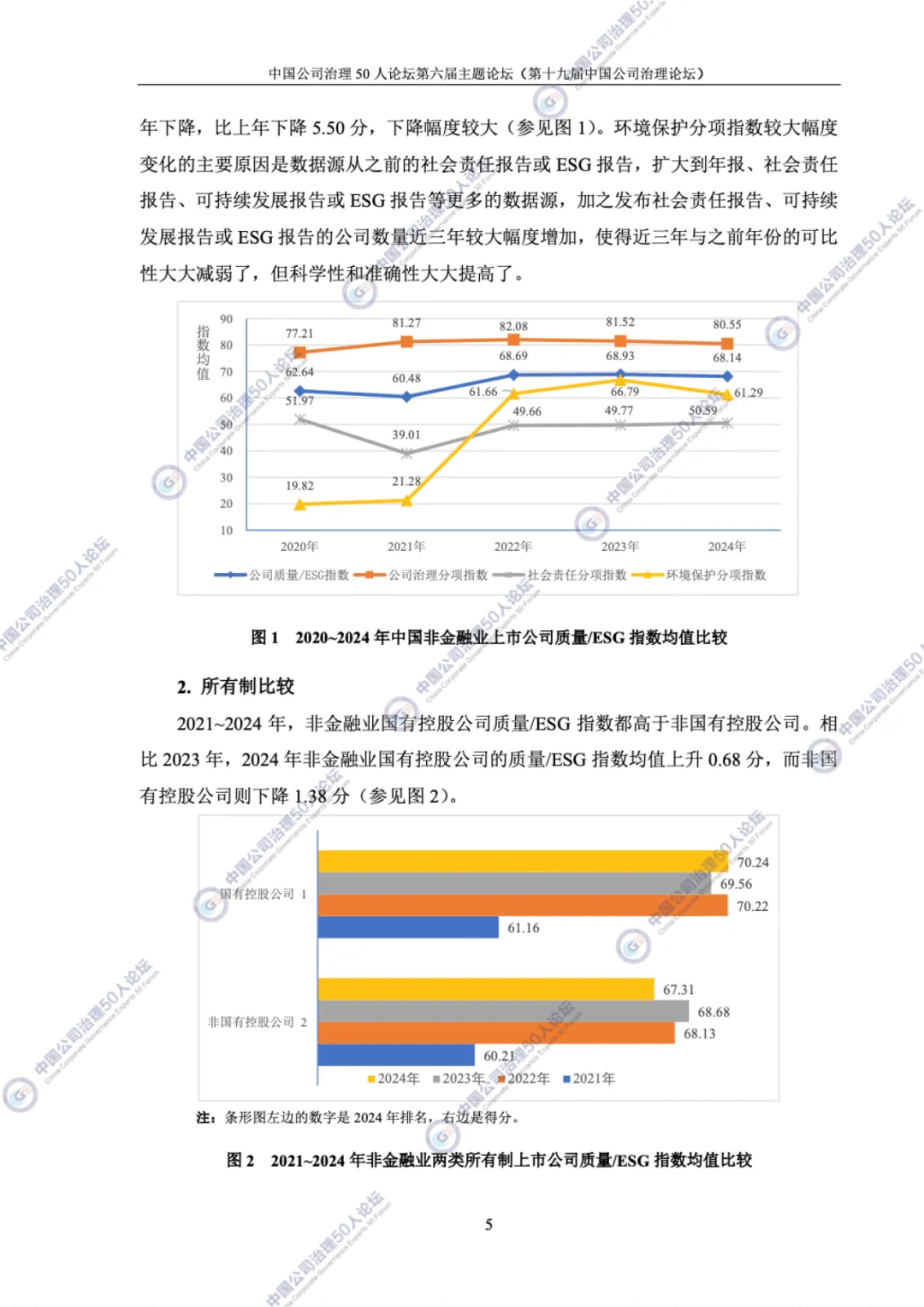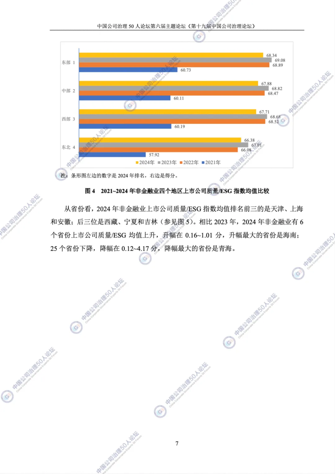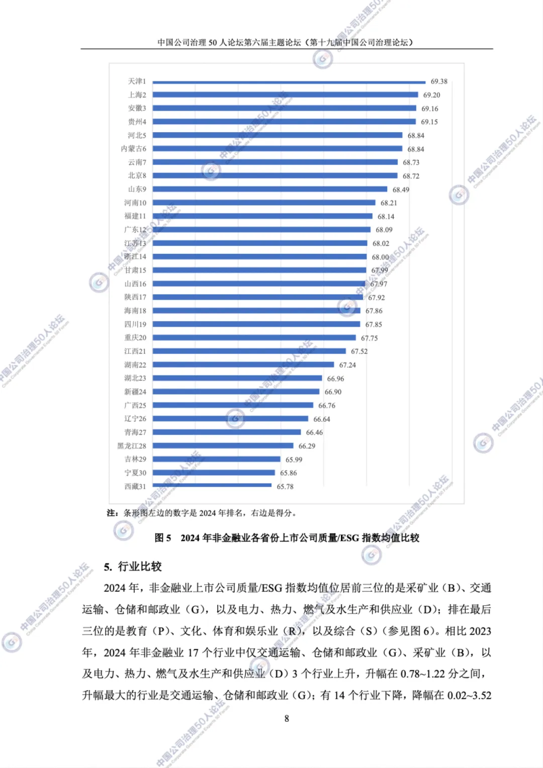 评价结果显示,非金融业方面,2020-2024 年指数均值先降后升再微降,2024 年为 68.14 分;国有控股公司指数持续高于非国有控股公司,中央企业实际控制公司表现最佳;东部地区稳居首位,天津、上海、安徽省份排名前三;采矿业等行业领跑,教育行业垫底;沪市科创板表现最优,北交所最差。金融业方面,2021-2024 年指数均值稳步提升至 73.76 分,国有控股公司、中央企业实际控制公司优势明显,东部地区领先,保险业排名细分行业第一。
