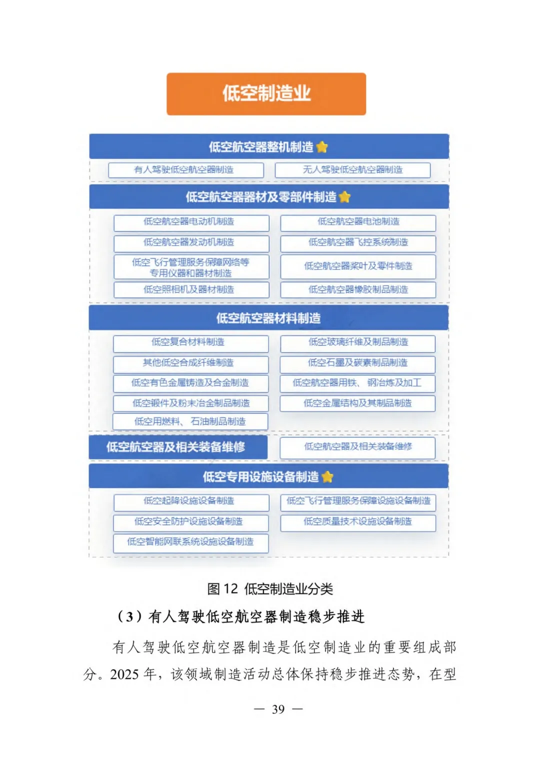 产业发展层面,低空制造业规模持续扩大,有人驾驶航空器适航取证取得突破,无人驾驶航空器迭代加速,eVTOL 成为关键技术方向并积极出海;低空运营业场景持续拓展,生产作业规模化、公共服务效能提升、低空运输商业化起步、低空消费稳步培育;低空基建与信息服务业加快布局,通用机场数量超额完成 “十四五” 目标,智能网联系统建设提速;低空配套业向体系化发展,科研、人才、金融、会展等支撑能力显著增强。