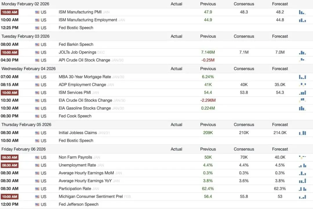 下周(2月2日到8日),市场将同时面对两条主线:一是财报季进入最密集、也是对指数影响最大的阶段;二是美国就业数据周,从 ISM、ADP 到非农,集中为美联储政策路径提供最新证据。