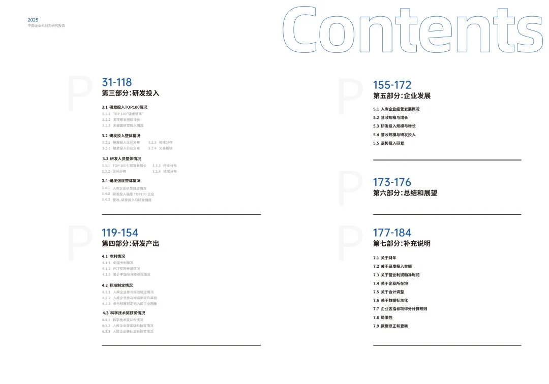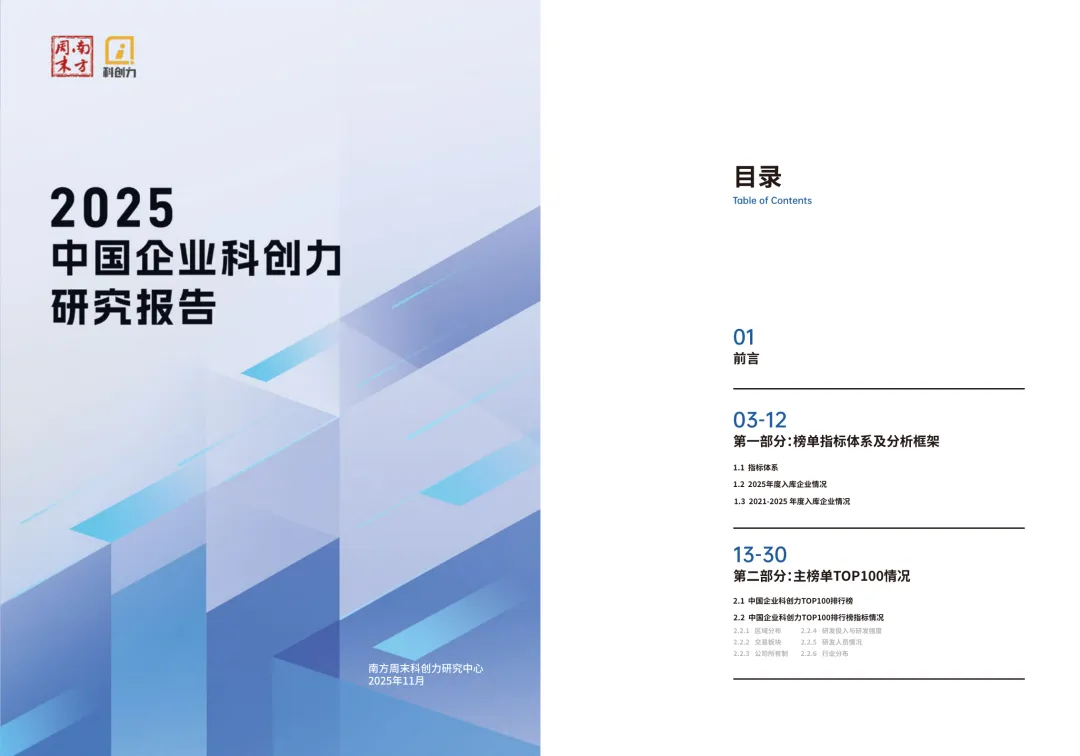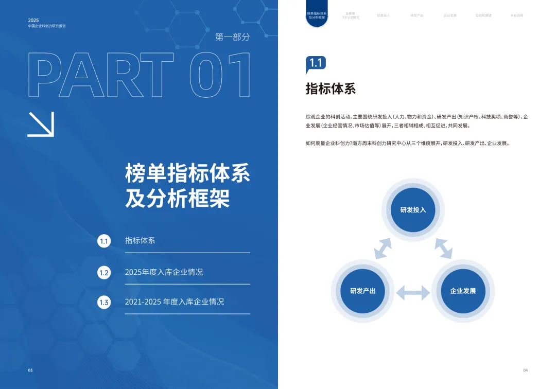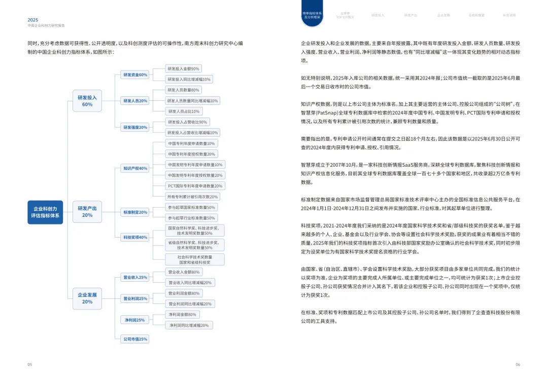 三大核心维度:涵盖研发投入(权重 60%)、研发产出(权重 20%)、企业发展(权重 20%),全方位度量企业科创力。 细分指标丰富:研发投入含资金、人员、强度三类指标;研发产出涵盖专利、标准制定、科技奖项;企业发展聚焦营收、利润、市值。 数据来源权威:研发数据取自企业年报,专利数据来自智慧芽数据库,标准制定数据源自全国标准信息公共服务平台。