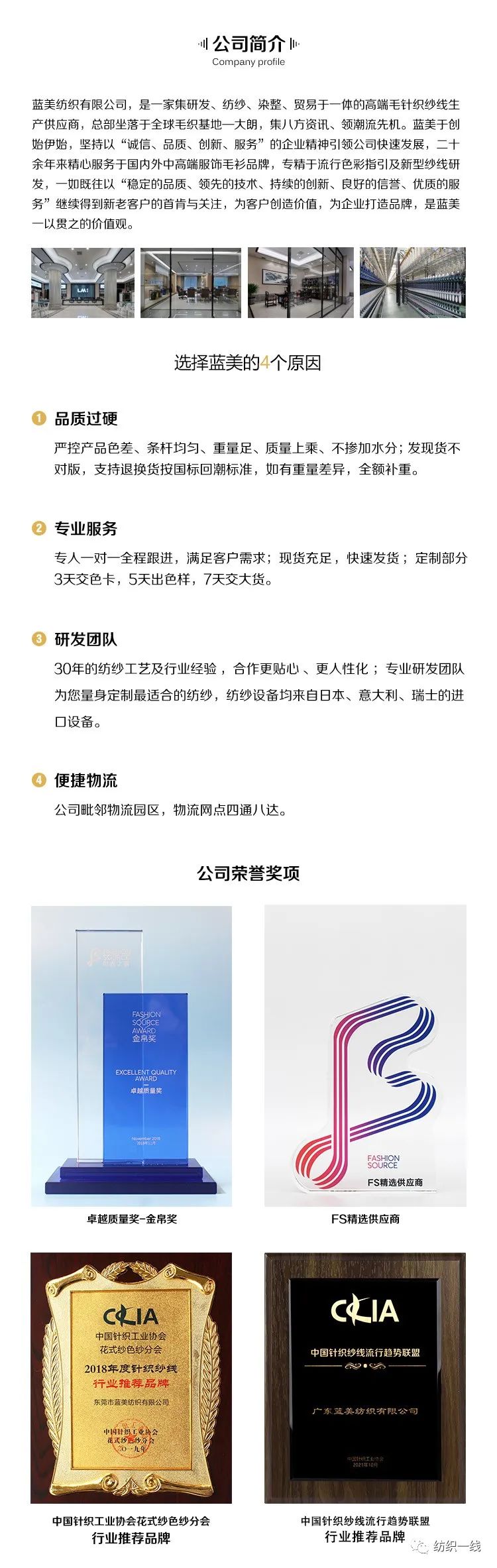 蓝美于创始伊始,坚持以“诚信 品质 创新 服务”的企业精神引领公司快速发展,二十余年来精心服务于国内外中高端服饰毛衫品牌,专精于流行色彩指引及新型纱线研发,一如既往以“稳定的品质,领先的技术 持续的创新 良好的信誉 优良的服务”继续得到新老客户的首肯与关注,客户创超价值,为企业打造品牌,是蓝美一以贯之的价值观。