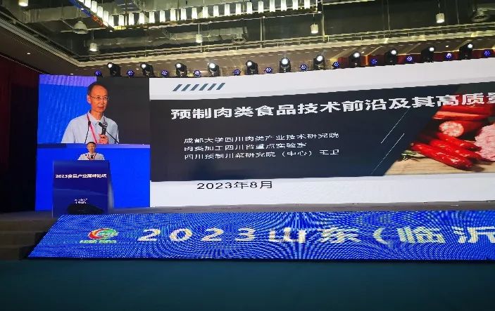 2023年8月中旬,山东(临沂)食品产业博览会及食品产业高峰论坛在临沂国际博览中心隆重召开。来自国内外企业和商家展示了食品产业发展新成就和新形象。数百位相关部门领导、专家教授、企业老总和工程技术人员出席论坛交流。肉类加工四川省团队参会,王卫教授受邀做“预制食品加工技术前沿及其高质量发展”报告。该报告以肉制品产业为重点,介绍食品原料生产、精深加工和保鲜贮运领域的最新技术进展及产业化应用现状,并就以清洁标签及其体系为特征,推进食品产业高质量发展,以满足市场日益增长对“天然、简单、健康”食品的需求进行了深度解读。