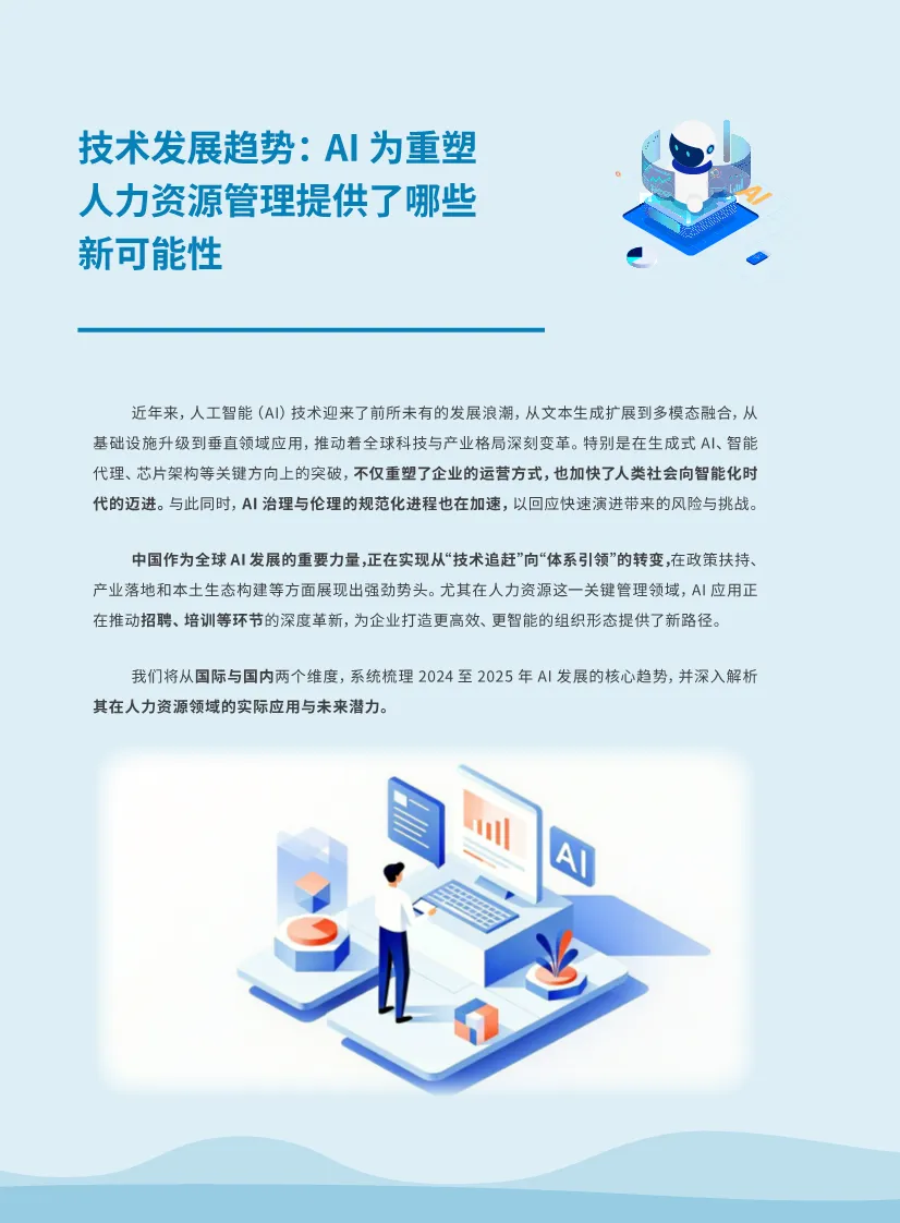 当前AI技术正从"技术图腾"加速蜕变为支撑企业运营的"数字基础设施",这一变革为人力资源领域带来重构工作流程、提升运营效率的战略机遇。然而,调研数据显示,尽管七成企业已在战略层面布局AI技术,实际应用成熟度却普遍偏低——65.73%仍处于Level1-2的观望或单点试水阶段,仅11.27%实现多场景深度应用,呈现出典型的"高期望、低落地"割裂状态。从全球视角看,AI技术呈现多模态融合、智能体协作、轻量化部署和具身智能嵌入四大方向。多模态技术使AI能同时处理文字、图像、语音和视频,让员工服务更拟真高效;智能体从工具升级为"虚拟员工",可自主完成端到端复杂流程;模型压缩技术使部署成本降低至1/14,中小企业也能轻松应用;人形机器人突破则倒逼HR重新设计岗位、能力体系与安全规范。本土市场呈现独特演进路径:国产大模型如DeepSeek以1/30的成本实现高性能,推动AI深度融入办公APP和微信小程序;政策红利支持下,国产芯片与半导体设备加速替代,数据合规性显著增强;AI眼镜、陪伴机器人等硬件创新为沉浸式培训、跨文化模拟提供技术底座;百度、阿里等推动开源生态,使HR面对众多深耕本土场景的服务商。人力资源领域AI应用呈现"三高三低"特征:战略重视度高但执行成熟度低、场景覆盖广度大但功能渗透深度低、未来投入意愿强但当前预算明确度低。83.57%的企业尚无明确预算规划,预算不足与数据安全成为主要卡点。近半数企业未能量化AI收益,但74.82%认为在招聘效率提升上效果明显。应用环节呈现明显分化:招聘流程管理成为渗透率最高的场景(71.22%),其次是培训开发(67.92%)和员工体验(62.26%)。但深度应用面临数据质量瓶颈——"HR相关数据积累较差,难以训练优化模型"被68.97%企业视为核心挑战。此外,产品成熟度不足、用户体验待优化、使用者专业要求高等问题也制约着应用深化。成功落地企业呈现出清晰的场景选择逻辑:高需求、强痛点、可量化是招聘场景成为突破口的关键。丹纳赫集团通过"多场景AI外呼机器人+共享人才库+AI视频面试"组合拳,将简历筛选效率提升数倍,其核心经验在于:以真实数据验证效果、坚持可行可控原则、将转化率而非入职率作为衡量标准。培训领域则呈现标准化程度高、结构化特征强的优势。中国电信的"AI+学习"三年行动计划颇具代表性:2024年建产品,2025年建规范,2026年造文化。通过将12万门课程知识点化、构建智能搜索推荐系统,实现"千人千面"自适应学习。针对数据模型开放度不足的瓶颈,通过拓展至上千个推荐模板持续优化,解决"推荐内容雷同"问题。其成功关键在于战略牵引、文化传承、管理者支持与专业人才储备的四位一体。员工体验提升场景因影响面广、感知收益大而快速普及。上海电气选择应届生积分落户作为切入点,因其"与现有制度关联度弱、规则清晰、刚需明显、数据完备"。通过本地部署大语言模型,实现政策评分、材料辅助、智能查询功能,将三个月的语料库搭建转化为可持续运营的知识体系。一汽-大众则打造"众问"智能助手,发动员工端、政策端、HRSSC端三角色共建语料库,通过工单机制实时监控纠偏,实现"能问、能办、能查询"的敏捷响应。绩效管理正从目标设定向全流程智能化演进。某多元化集团通过AI辅助指标生成,将PDCA循环中"撰写笼统、反复沟通"的痛点转化为"智能校正、快速成型",沟通成本大幅下降。绿城中国则构建"管理者驾驶舱",实现团队动态监测、选人用人辅助、人才路径规划与风险预警,推动HR从执行者转向战略支持者。数据分析场景最具变革潜力。绿城中国的离职预测模型基于多年访谈数据与建模能力,将访谈分析自动化、洞察质量一致化、模型反馈闭环化,实现"洞察—预测—优化"三段闭环。其经验表明:HR需走到转型前台,具备数据理解力、流程重构力与人机协同力,通过"价值明确、风险可控、数据成熟"的试点原则,避免高开低走。面对"试验田"选择难题,资料提出 "高产出与低风险并行,建立AI能力是首要目标" 的方法论。高产出场景需满足:战略牵引强、流程成熟、影响广泛、提效明显、数据完备、结果可衡量、技术现成。低风险则需考虑:安全性高、紧急度低、阻力较小、试点性强。当前企业普遍认可的先行场景包括:招聘流程管理、政策智能问答、课程设计、目标设定、离职风险预测。这些场景共同特征是:规则相对清晰、数据结构化程度高、员工感知度强、可快速验证价值。AI在人力资源领域的演进将经历三个阶段:单点工具→流程嵌入→生态重构。当前多数企业停留在工具替代层面,但丹纳赫的"人才意向库联动内外部流动"、绿城中国的"数据洞察驱动人才保留"、中国电信的"万人级调优知识库"已揭示未来方向——打破场景壁垒,构建"选育用留"全链条智能生态。这场蜕变标志着HR核心价值从流程管控转向人才价值创造。当AI成为支撑人才全生命周期的基座,HR将回归本质使命:以技术为舟、以人性为舵,在高效运营与深度关怀的平衡中,释放个体与组织的最大潜能。这不仅是技术胜利,更是人才管理新纪元的开启。技术成本持续下降、应用门槛降低,将推动AI从战略高地走向组织基础能力,最终实现"人人皆有AI助手"的普惠图景。部分内容预览
