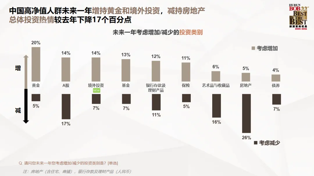 未来一年投资方向,高净值人群计划增持黄金、境外投资、基金和保险,减持房地产