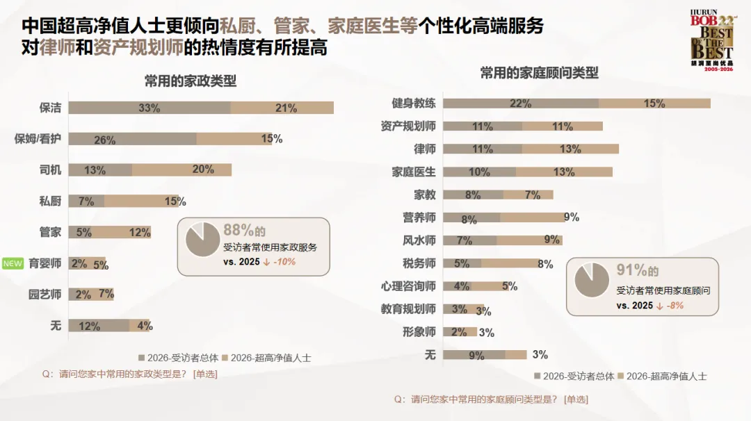 在常用的家庭顾问方面,健身教练(22%)稳居首位,其次是资产规划师(11%)和律师(11%)。今年,高净值人群对资产规划和风险管理的需求有所上升。
