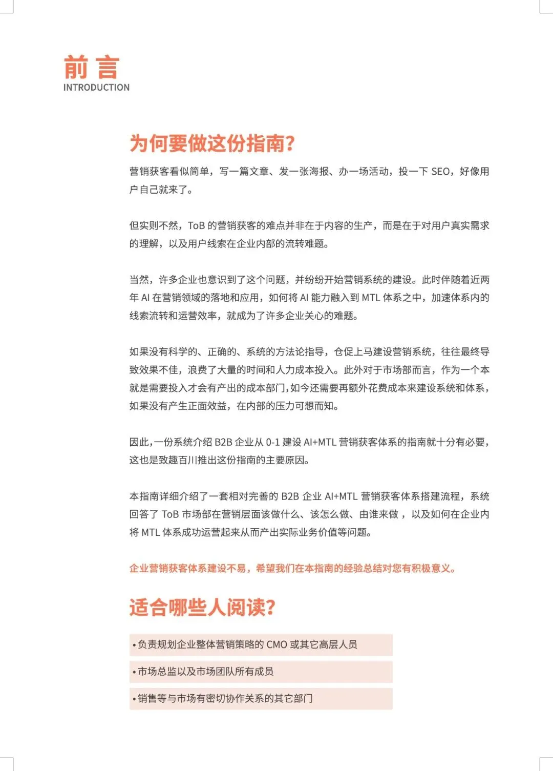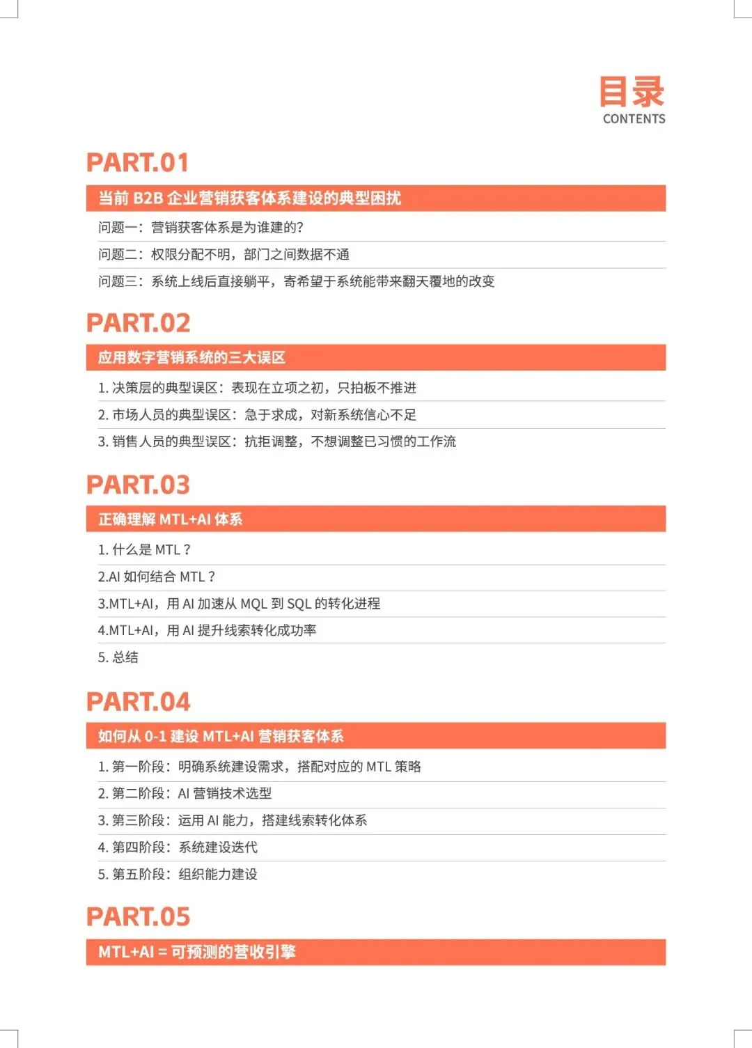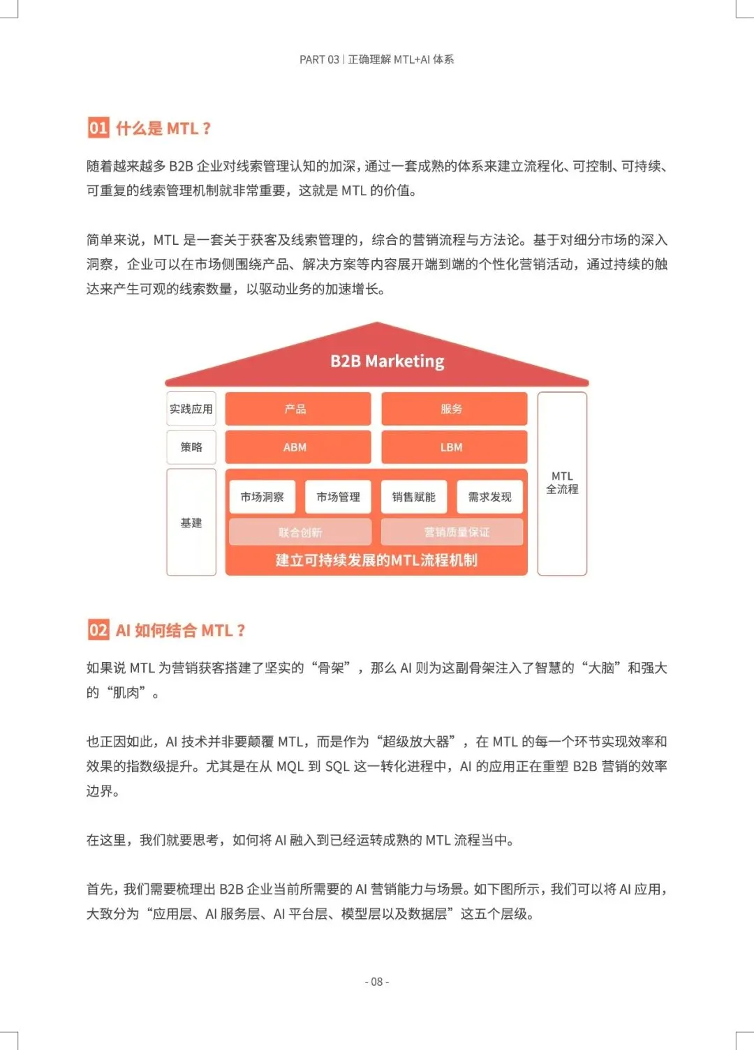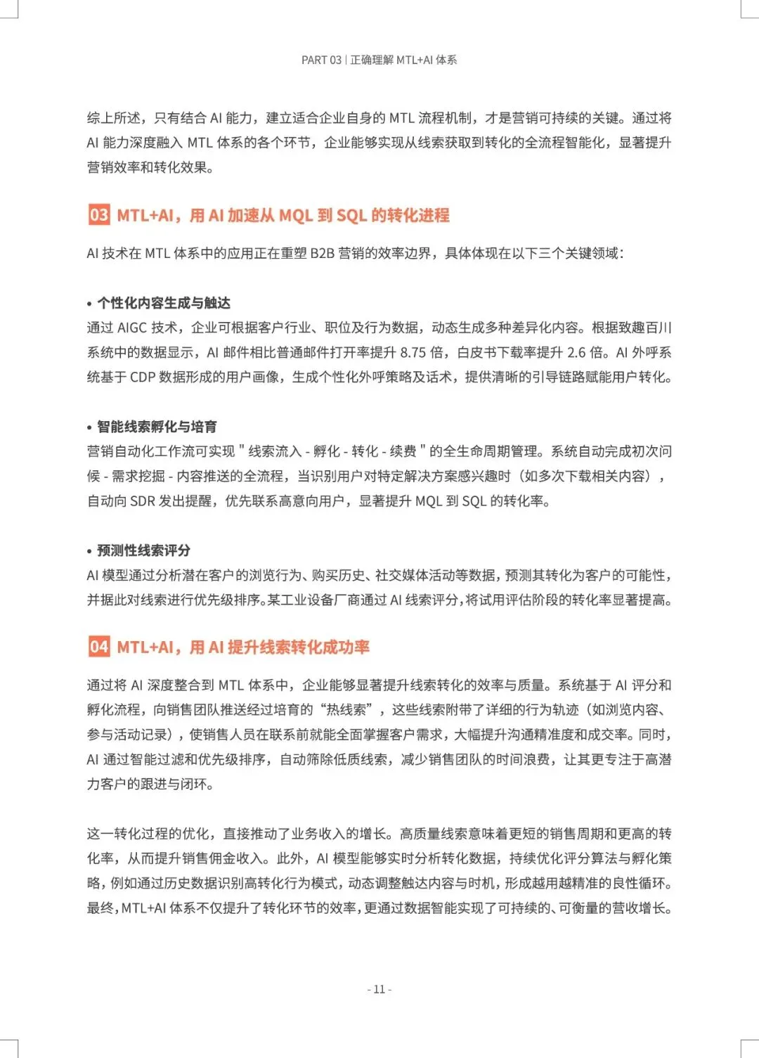 B2B营销正从“经验驱动”转向“AI预测驱动”,MTL体系与AI的深度融合,旨在打造一台可预测、可优化的“营收引擎”。 报告指出,近半数B2B企业缺乏AI使用指南,而成功部署AI+MTL体系的企业已实现显著增效:AI邮件打开率提升8.75倍,AI SDR使人工操作时间减少80%以上,线索转化率提升30%。市场部与销售部的数据孤岛、组织惯性是最大落地障碍。