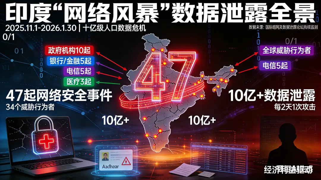 在刚刚过去的近三个月(2025年11月1日至2026年1月30日)里,印度的数字疆域遭遇了一场密集而猛烈的“网络风暴”。根据对多个国际知名暗网及数据泄露论坛的持续监控,我们共记录到 47起 明确针对印度实体的网络安全事件,涉及 34个 活跃的威胁行为者。这些事件不仅数量惊人,其破坏性更令人瞠目:从涉及 8.5亿条记录的印度医学研究理事会(ICMR)数据,到数百万计的公民身份证(Aadhaar)、金融、交通出行信息被盗,一场关乎十亿级人口数据安全的危机正在暗处发酵。本文将对这场持续的网络威胁进行深度剖析,揭示其运作模式、核心团伙与潜在影响。