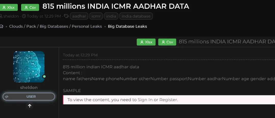 事件经过:2026年1月底,威胁行为者“X Forum Bot”在论坛公开宣称持有印度顶级医学研究机构ICMR的8.5亿条公民数据。这并非ICMR数据首次被觊觎,早在2025年11月,就有不同团伙(如sheldon、An0nyByte)多次泄露或声称持有相关数据。本次事件将规模推向顶峰,泄露数据可能包含公民身份、健康信息等极度敏感内容。