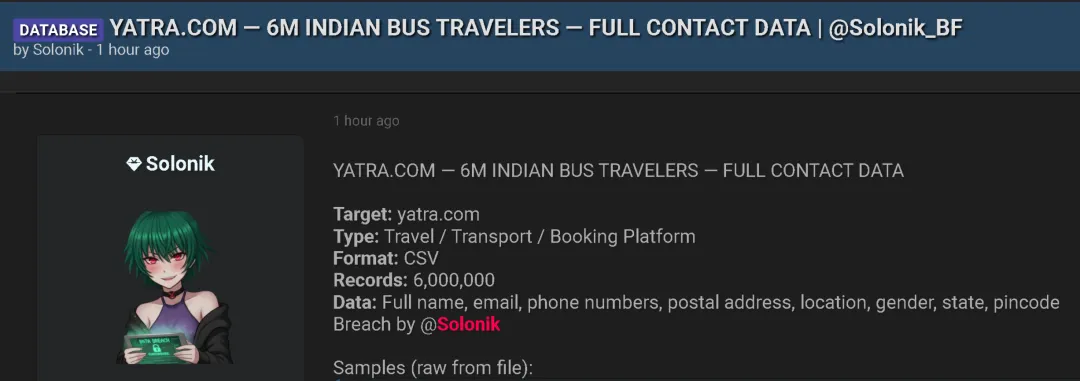事件经过:威胁行为者“Solonik”公开出售印度知名在线旅游平台Yatra.com的数据库,涉及600万巴士旅客的完整个人身份信息(PII)。