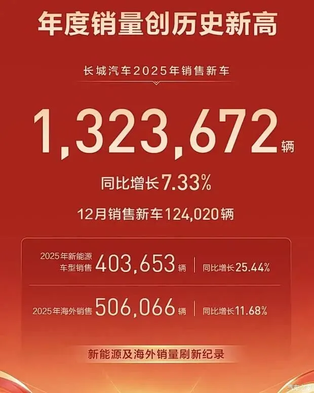 在“增收不增利”的表象下,长城的产品结构正在发生质变。数据显示,2025年长城单车平均收入达到16.83万元,同比提升约4500元,创下历史最佳水平,这意味着品牌已逐渐脱离低价竞争泥潭。销量方面,全年累计销售132.37万辆,其中新能源及海外市场表现强劲,海外销量突破50万辆,同比增长11.68%。