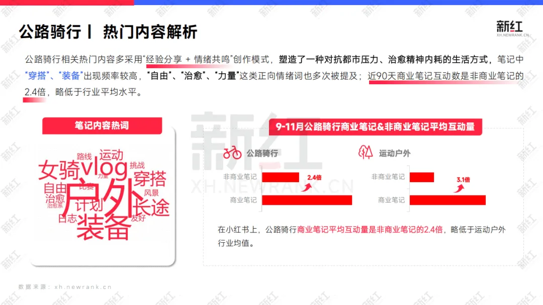 2025年小红书运动户外赛道持续高速发展,相关话题搜索量级超36亿,笔记内容达1亿条,新场景、新用户与新内容不断涌现。报告聚焦公路骑行、城市慢跑、亲子滑雪三大细分领域,通过分析热点话题、爆款笔记及品牌营销数据,呈现行业趋势与创作生态,为从业者提供营销参考。