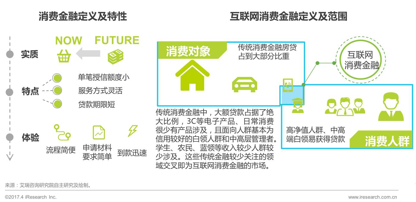 互联网消费金融,指依托互联网技术发展起来的新型消费金融模式,即借助网络进行线上的审核、放款、消费、还款等业务流程。互联网消费金融亦可分为狭义与广义。广义的互联网消费金融泛指一切依靠互联网打造的金融服务平台,包括传统消费金融的互联网化。狭义的互联网消费金融仅指互联网公司创办的消费金融平台。本报告中以狭义的互联网消费金融为重点研究对象。传统消费金融专注于大额信贷产品,且用户大部分为净值较高的人群。互联网消费金融是作为传统消费金融的补充而存在的。