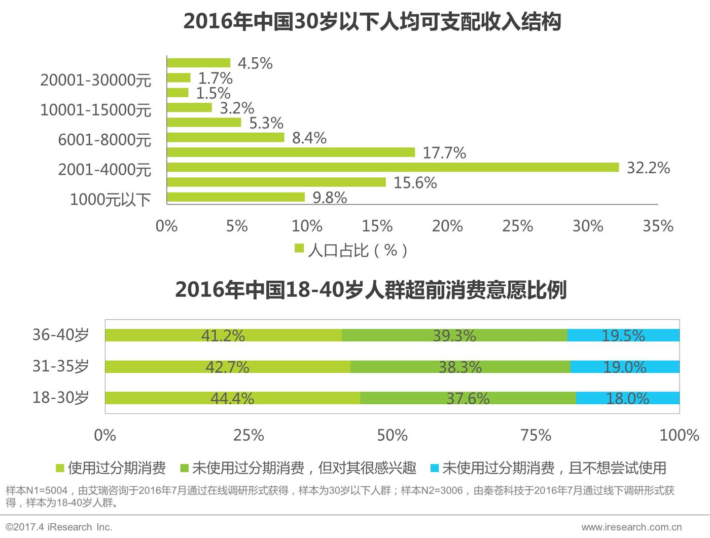 2016年,按照中国人均可支配收入能力划分,30岁以下的群体中75.3%的人每月可支配收入低于6000元。在40岁以下人群中,近4.5成人群曾使用过分期消费功能,超3成人群没有使用过分期消费,但对此很感兴趣。