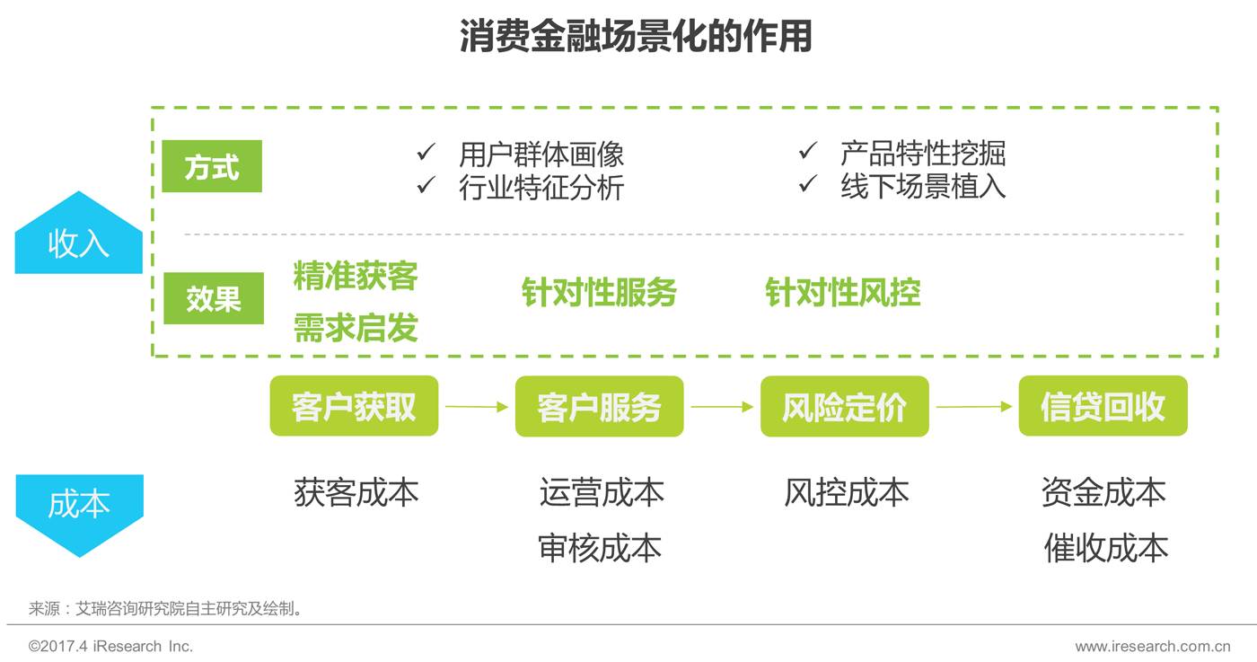 场景化通过对消费中进行金融服务的嵌入,来刺激或促使消费者通过信贷的方式完成消费交易。促进作用体现在精准捕捉潜在信贷客户,以及对客户的需求启发两个方面,除此之外,场景化必然要求消费金融机构对消费产品、客户进行深入研究与刻画,基于这种刻画,消费金融机构得以根据产品特性提供针对性金融服务,风控得以更准确地定位风险点,使得风险定价更为准确。