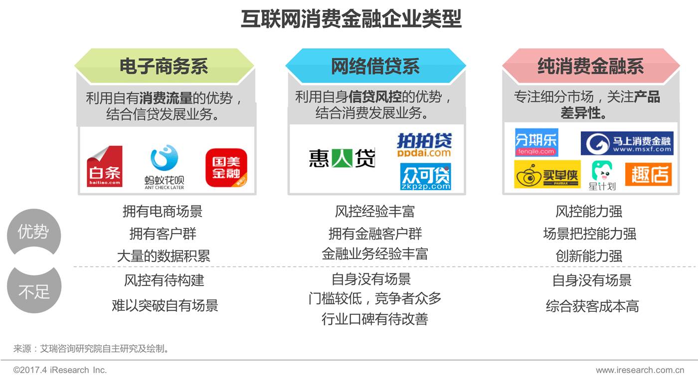 2013年,随着分期乐等互联网公司的成立,消费金融开始进入大众的视线内。2015年,各方开始大力布局互联网消费金融业务,该年被称为互联网消费金融的元年。按照企业业务类型分类,我们把现阶段互联网消费金融公司分成三大类:电子商务系、网络借贷系和纯消费金融系。