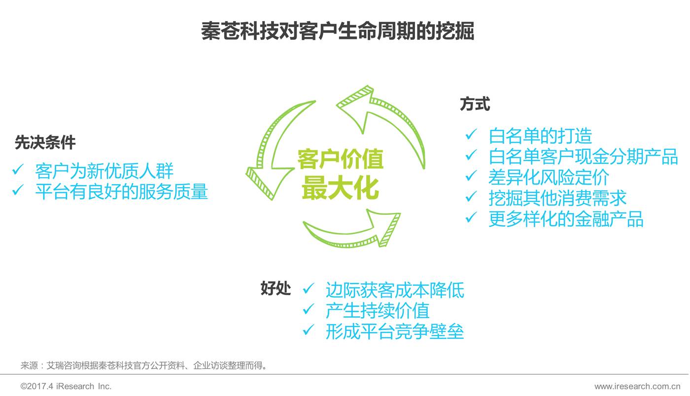 秦苍科技致力于将客户价值在其生命周期内实现最大化。实现价值最大化存在一定的先决条件,在良好的服务质量基础上,新优质人群具有高客户粘性,能在秦苍科技平台持续接受金融服务。秦苍科技通过现金分期、多样的金融产品等多种方式实现价值最大化。这样的好处在于,二次、三次等、多次消费的客户的边际获客成本极低,保证了平台获取持续价值,形成竞争壁垒。