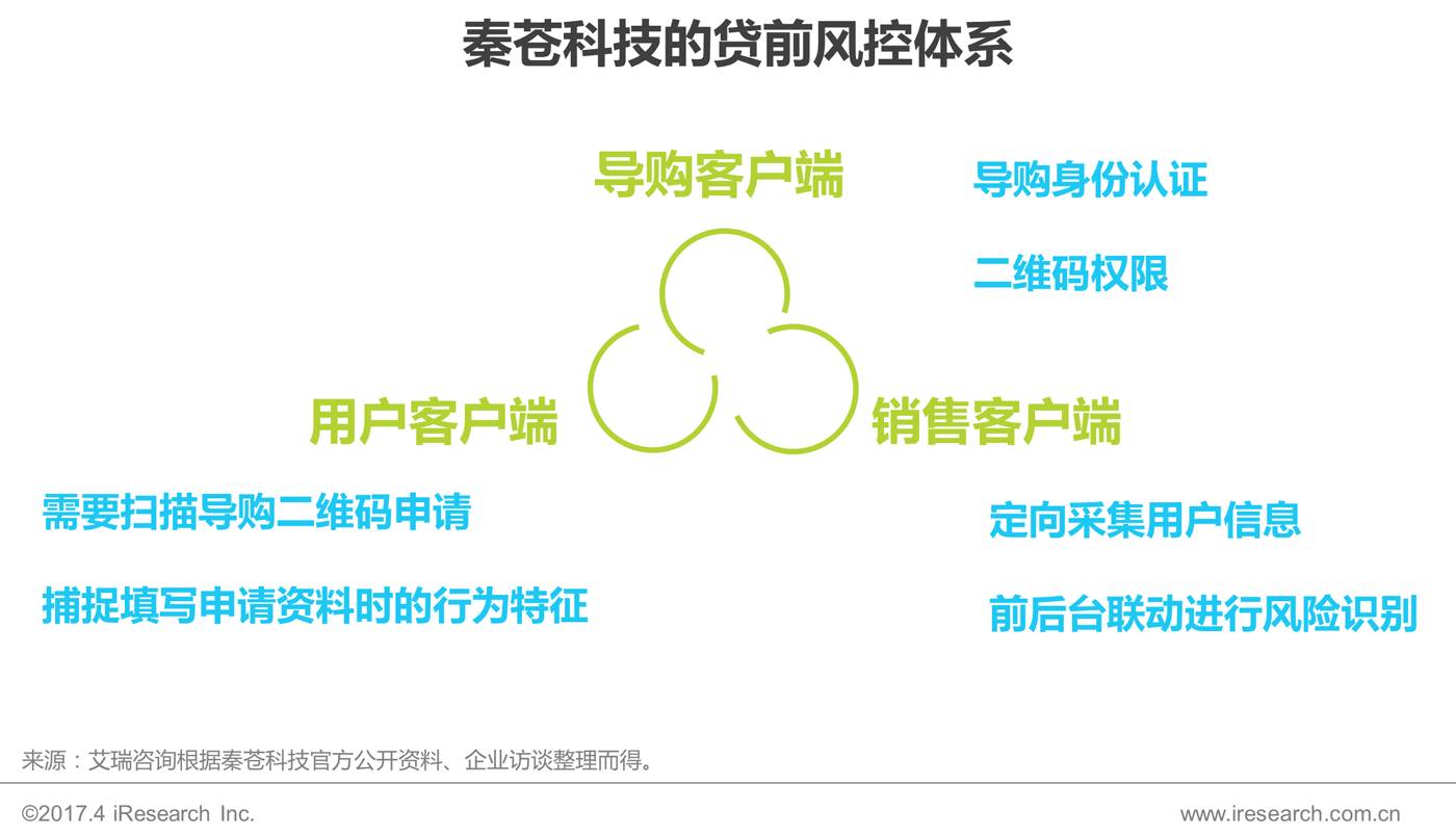 秦苍科技通过三个客户端相互制衡实现贷前风控。用户端,直接下载的买单侠App或星计划App无法使用,需要扫描店员(面诊师)出示的二维码才能申请,二维码有很短的有效期,防止线上申请的逆向选择、锁定场景。导购端,通过前期收集店员(面诊师)的个人信息给店员(面诊师)开通权限,赋予二维码权力,从而控制整个场景真实地发生在线下。销售端,用于前方销售人员巡逻时的风险识别反馈。