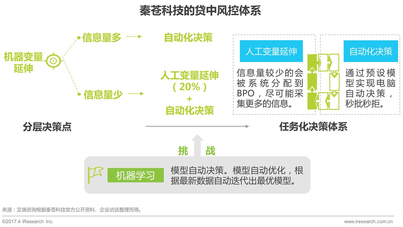 秦苍科技在贷中风控环节搭建智能体系,主要包括分层决策点和任务化决策体系两个板块。分层决策点根据客户的信息齐备程度对客户风险状况进行初步判断,将风控任务拆解,信息量较少的会被分配给BPO,尽可能采集更多的信息。分层完毕后进入任务化决策体系,相应的任务自动分配到相应的系统,待任务完成后再组合,即实现风险的总体评价。