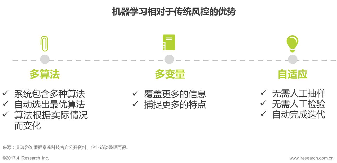 秦苍科技利用机器学习完成部分风控任务,机器学习在风控方面可以极大地释放人工,同时在理论上可以实现比人工识别更好的效果。具体应用过程中,秦苍科技利用冠军挑战者的方式不断优化模型,内置多个算法,且在业务的扩大过程中稳步渗入新的机器学习算法,在保证安全性的基础上推进风控的革新。