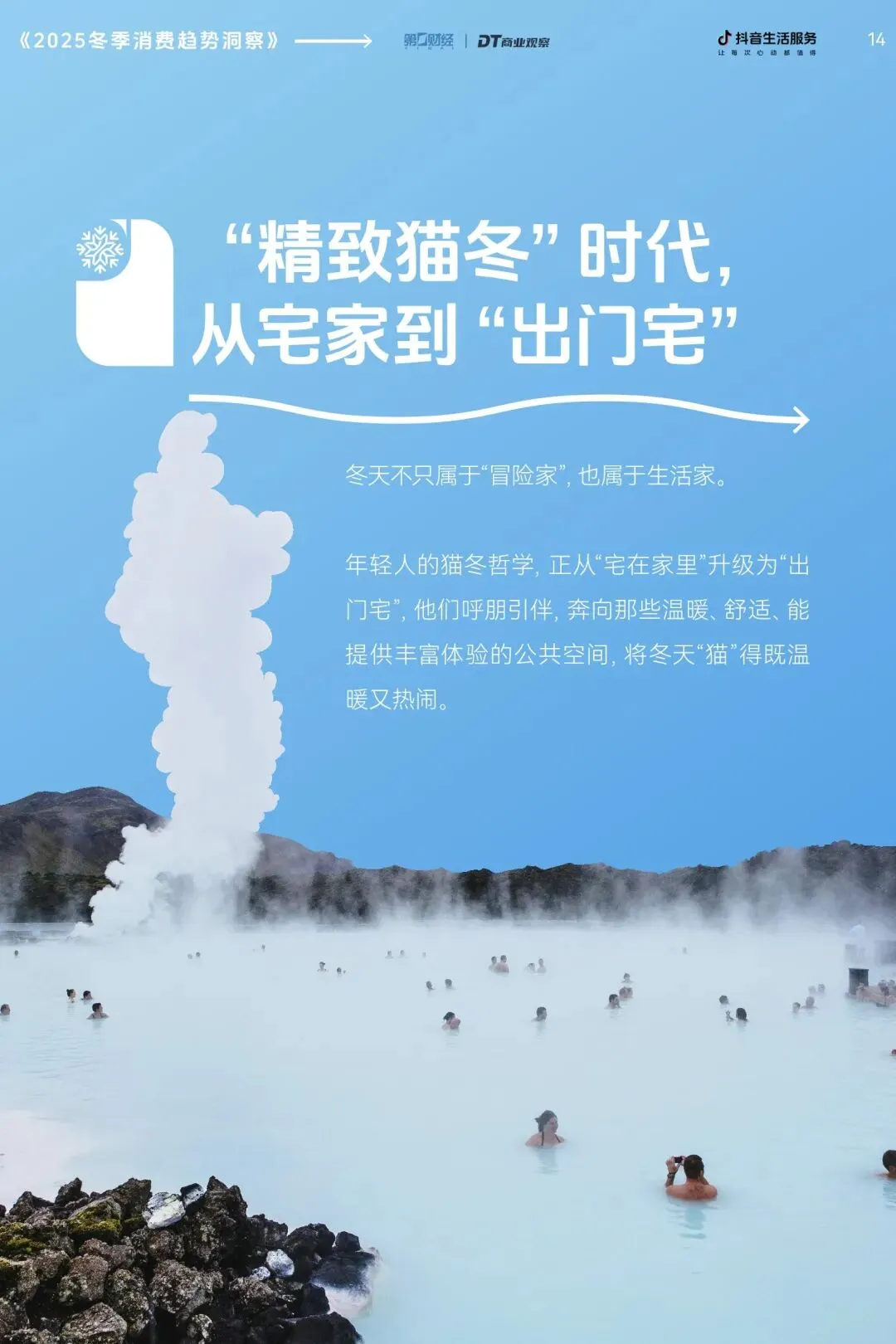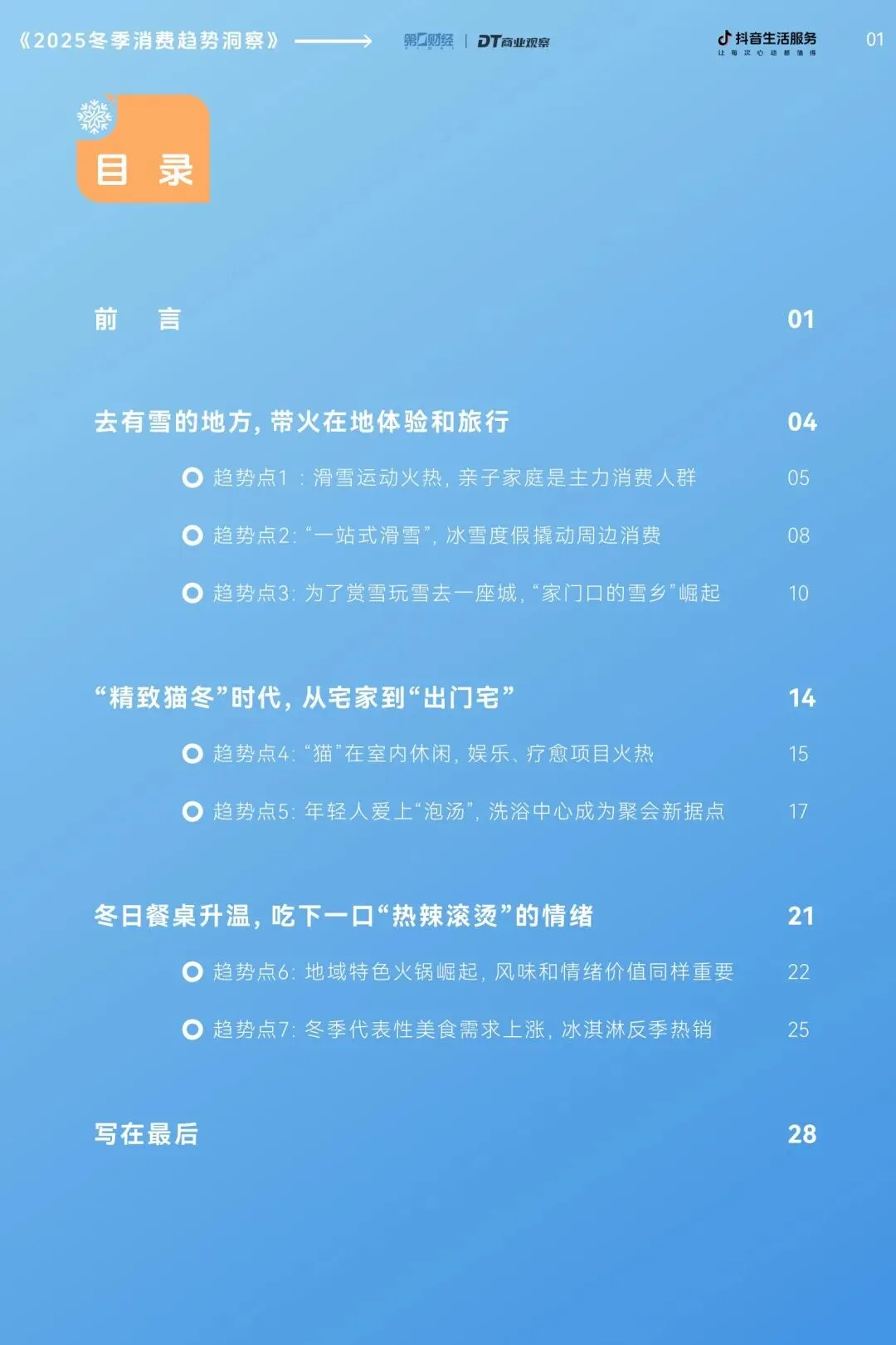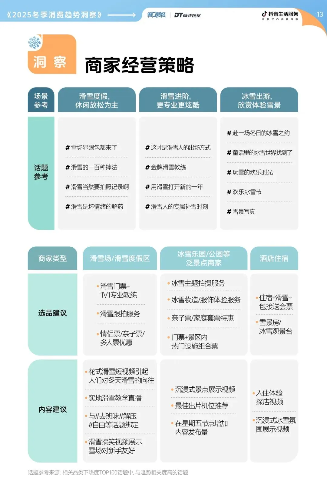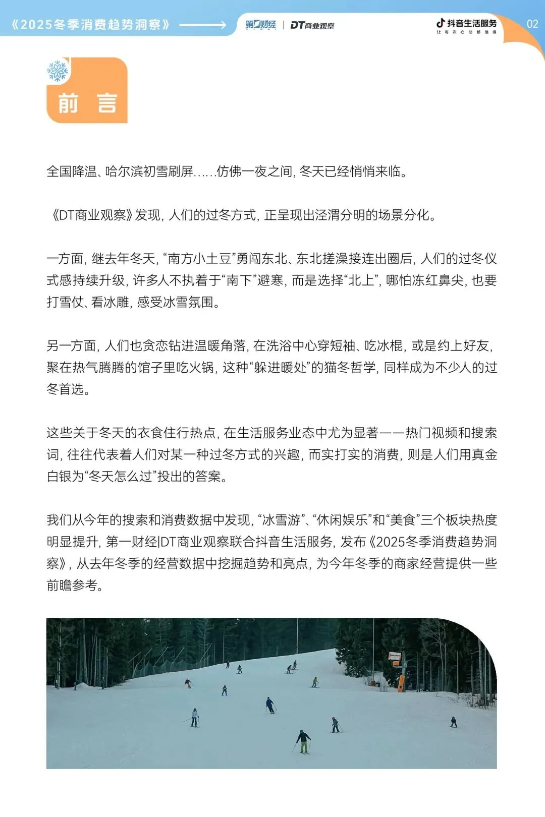 报告由第一财经、DT 商业观察与抖音生活服务联合发布,基于搜索与消费数据,聚焦 2025 冬季 “冰雪游”“休闲娱乐”“美食” 三大核心消费板块。分析冬季消费场景分化特征,挖掘滑雪、泡汤、火锅等热门消费趋势及用户行为特点,为商家经营提供前瞻参考。