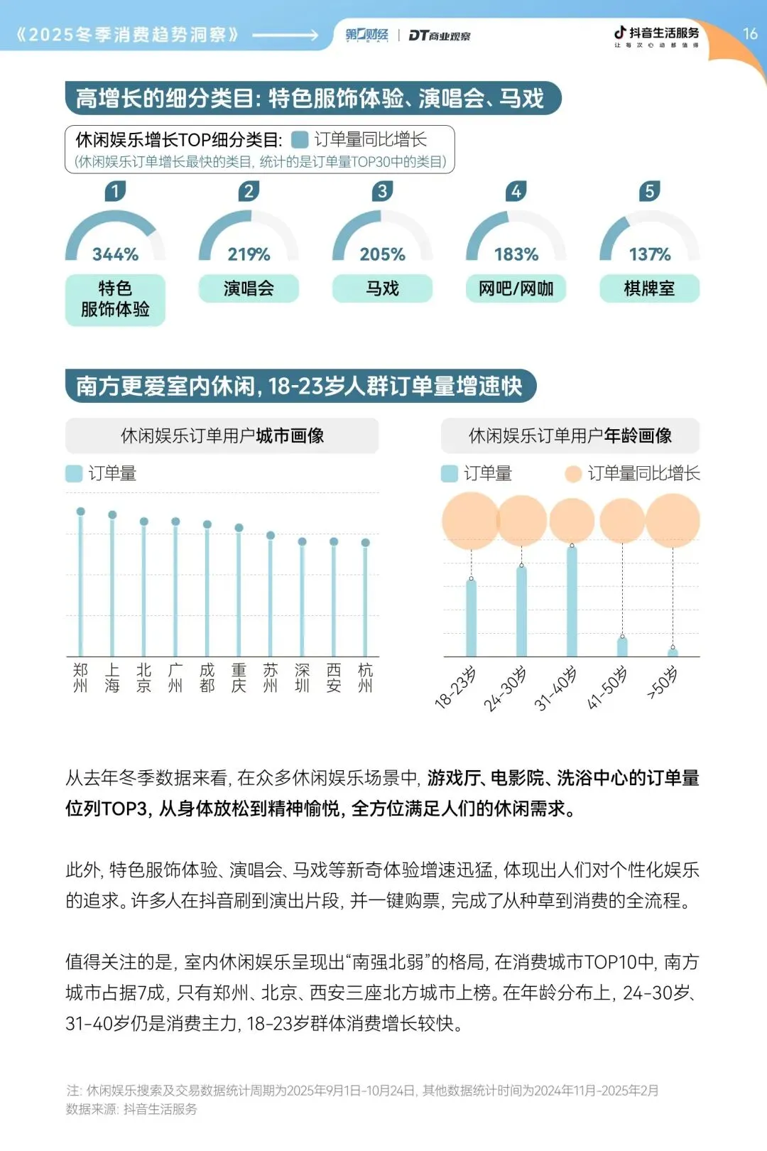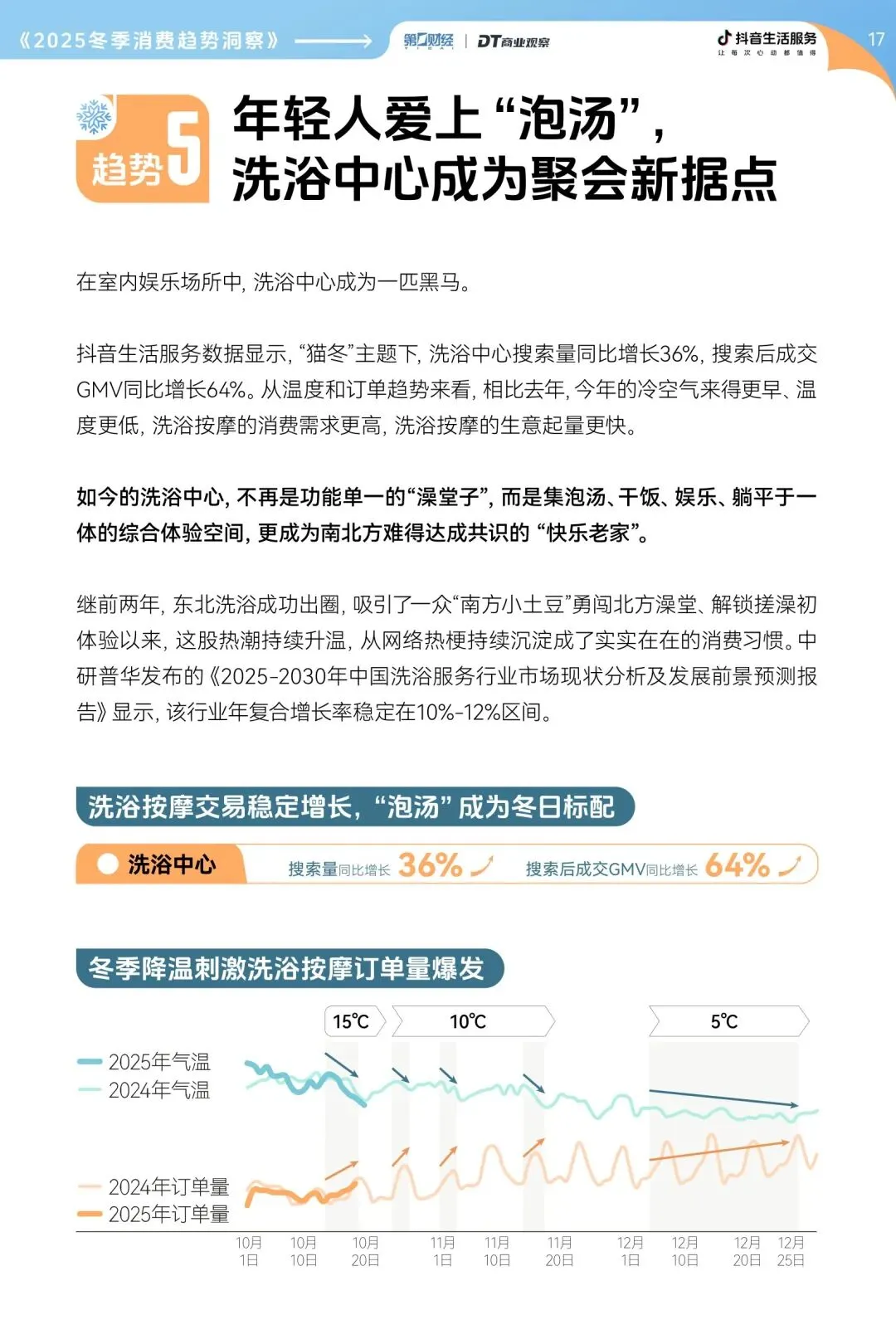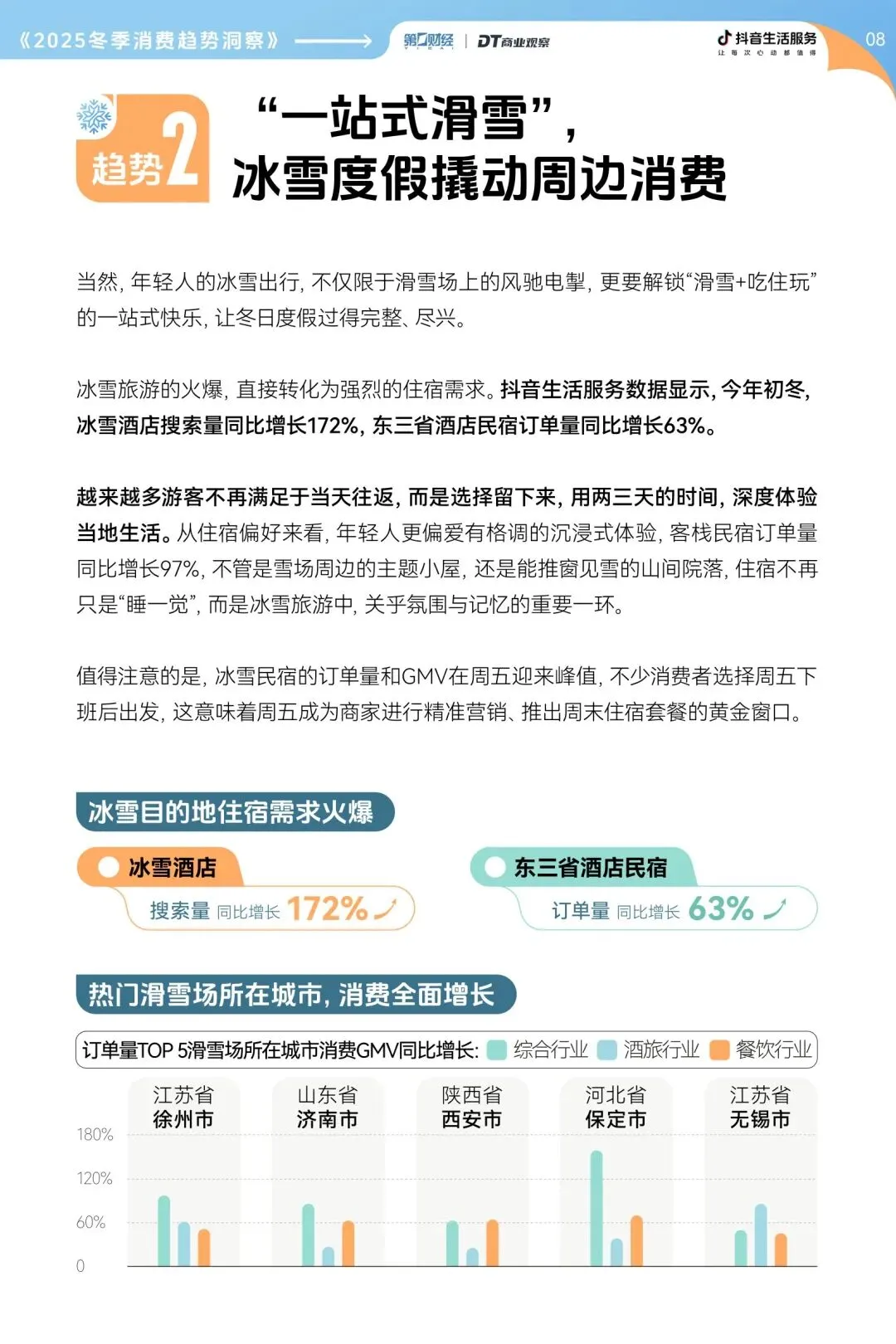 冰雪旅游爆发式增长,亲子与年轻群体成主力。2024-2025 雪季全国滑雪人次达 2605 万,同比增长 12.9%,抖音平台滑雪场搜索量同比增长 29%,成交 GMV 增长 49%。亲子家庭 GMV 占比 54%,“新生世代” 增速迅猛,“南人北上” 滑雪成新趋势。冰雪旅游带动周边消费,客栈民宿订单增长 97%,热门滑雪场所在城市餐饮、住宿等行业全面升温。 “家门口的雪乡” 崛起,冰雪体验多元化发展。除传统热门冰雪景区外,河北、河南等地涌现一批短途可达的冰雪目的地,承接周边居民周末玩雪需求。北方依托天然资源打造户外体验,南方通过室内场馆打破气候限制,深圳、上海等地室内冰雪乐园跻身热门景点。直播推荐成为重要引流渠道,相关订单占比 23%,同比增长 120%。 休闲娱乐向室内转移,洗浴中心成社交新据点。冬季 “出门宅” 成潮流,休闲娱乐搜索量同比增长 63%,成交 GMV 增长 393%,游戏厅、电影院、洗浴中心订单量居前。洗浴中心搜索量增长 36%,GMV 增长 64%,升级为集泡汤、餐饮、娱乐于一体的综合空间,年轻群体订单增速显著,成为亲友聚会新选择。 冬日餐饮注重情绪价值,火锅与特色美食热销。火锅搜索量同比增长 21%,GMV 增长 50%,川渝火锅稳居榜首,云南火锅、老北京火锅等地域风味增速明显,滋补类食材与锅底受青睐。车厘子、烤红薯等冬季特色美食需求暴涨,车厘子搜索量增长 680%。反季消费兴起,冰淇淋 / 酸奶订单量同比增长 71%,成为年轻人追求反差快乐的仪式感消费。 消费场景与营销节点高度绑定,线上种草转化高效。周五成为冰雪旅游、住宿预订的下单峰值,节假日与冬季节点消费需求集中。商家通过短视频、直播展示场景氛围与产品亮点,结合 “解压”“社交” 等情绪点种草,77% 消费者被氛围感吸引后会收藏或团购。南方城市在室内休闲、餐饮消费中表现突出,50 岁以上群体在饮品消费中增速超 100%。