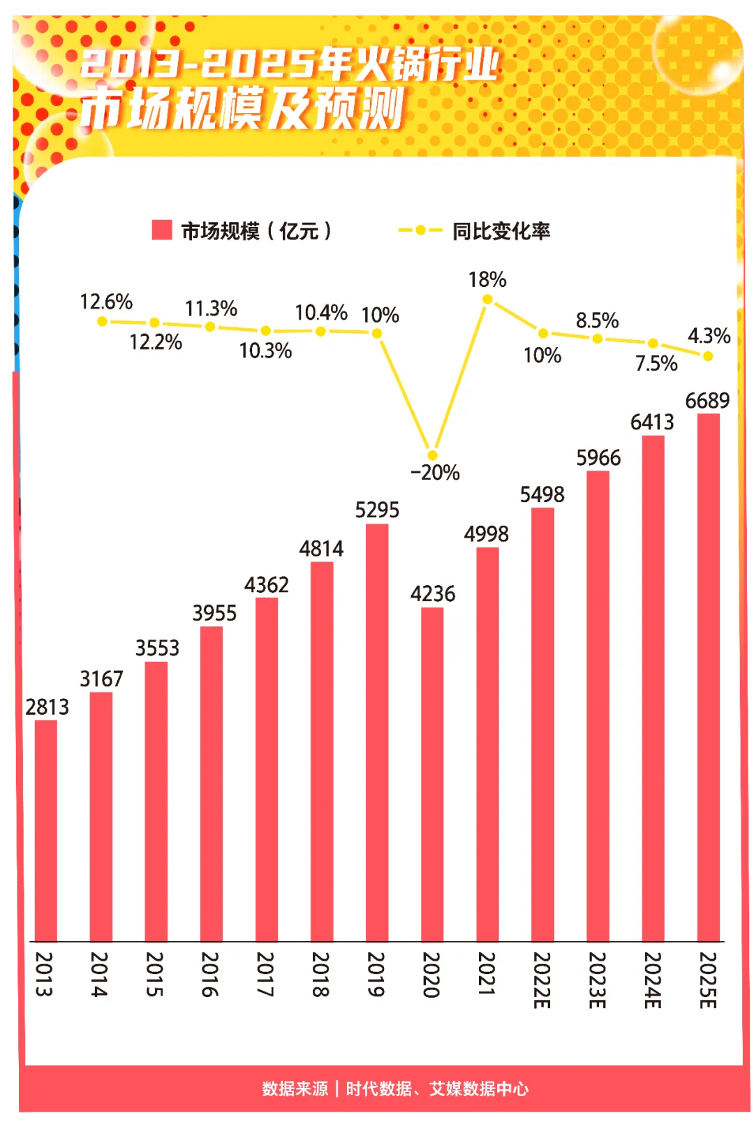 一个基本的共识是,火锅就是中餐最大的赛道。但你或许不知道的是,这个看似已经没有什么上升空间的市场,除了2020年外,规模一直保持增长趋势。艾瑞咨询的数据显示2021年中国火锅行业市场规模达到4998亿元,预计2025年市场规模将达到6689亿元。