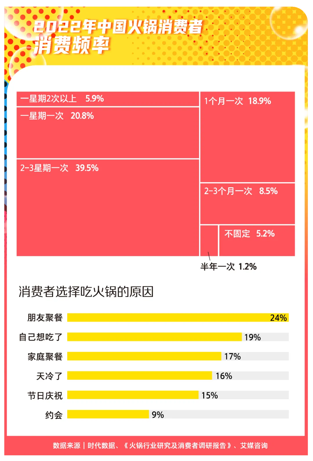 艾瑞数据显示,超过八成的消费者每个月至少会吃一次火锅,其中20.8%的消费者消费频率达到一周一次。吃火锅的理由从家庭聚会、朋友聚餐、约会、节日庆祝、天气冷了,以及就是直白地“自己想吃”。简单来说就是任何时候都想吃。