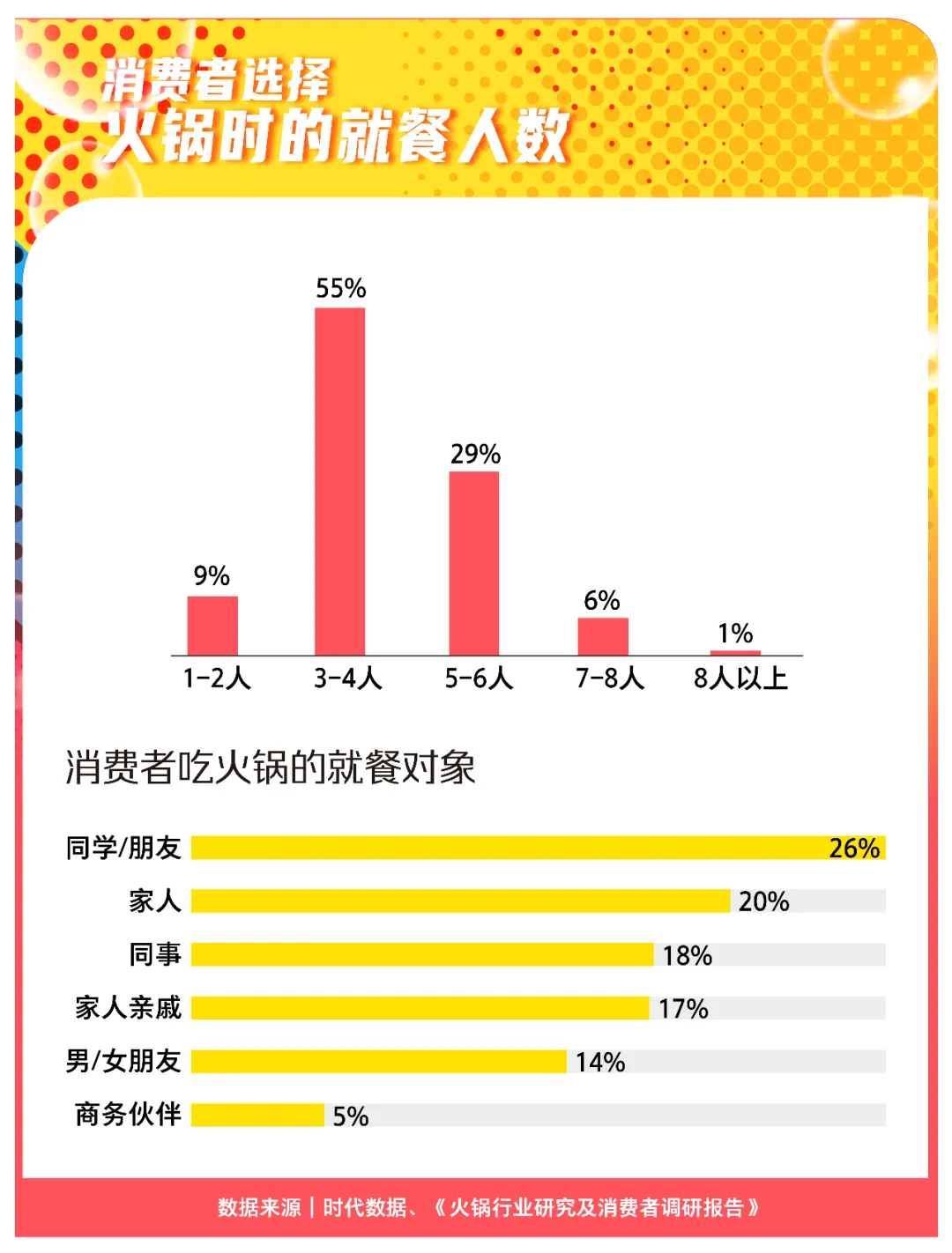 国民度如此之高的火锅,自然而然成为了聚餐约会的重要选择。消费者通常3-6人用餐,人群兼容朋友、家人、同事等。