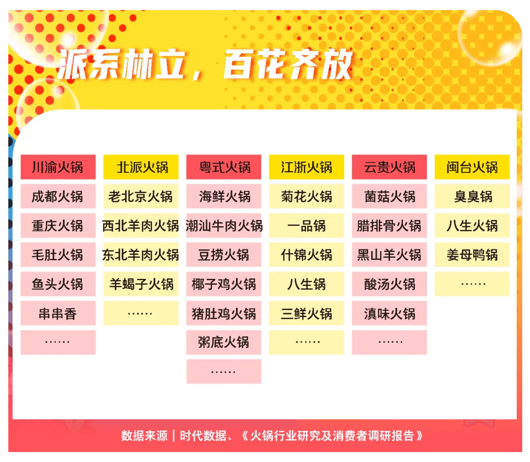 在历史的演变下,依据火锅的地域、工艺和口味不同,通常将火锅分为六大派系——以麻辣著称的川渝火锅,以铜锅、炭火和牛羊肉为招牌的北派火锅,以海鲜和清淡汤底为特色的粤系火锅,以天然食材和酸辣口味为精髓的云贵火锅,以及闽台火锅和江浙火锅。