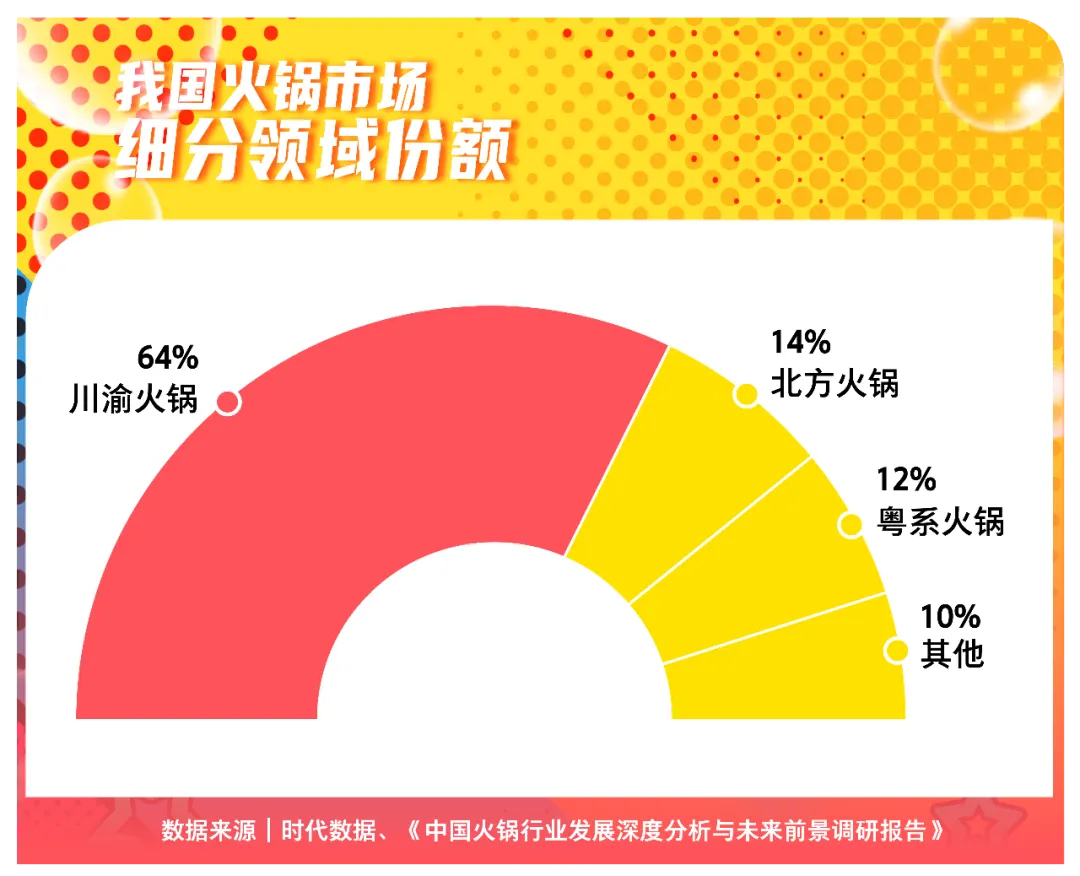 从市场份额来看,在火锅行业中,川渝火锅为最大细分领域,占据64%市场份额。