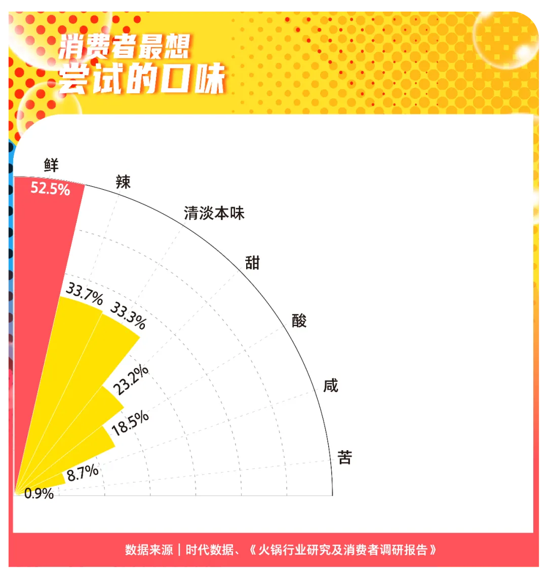 海南糟粕醋火锅所代表的“鲜”味已经成为了中国人偏爱的新口味。数据显示,“鲜”以52.5%的占比高居“消费者最想尝试的口味”榜首。