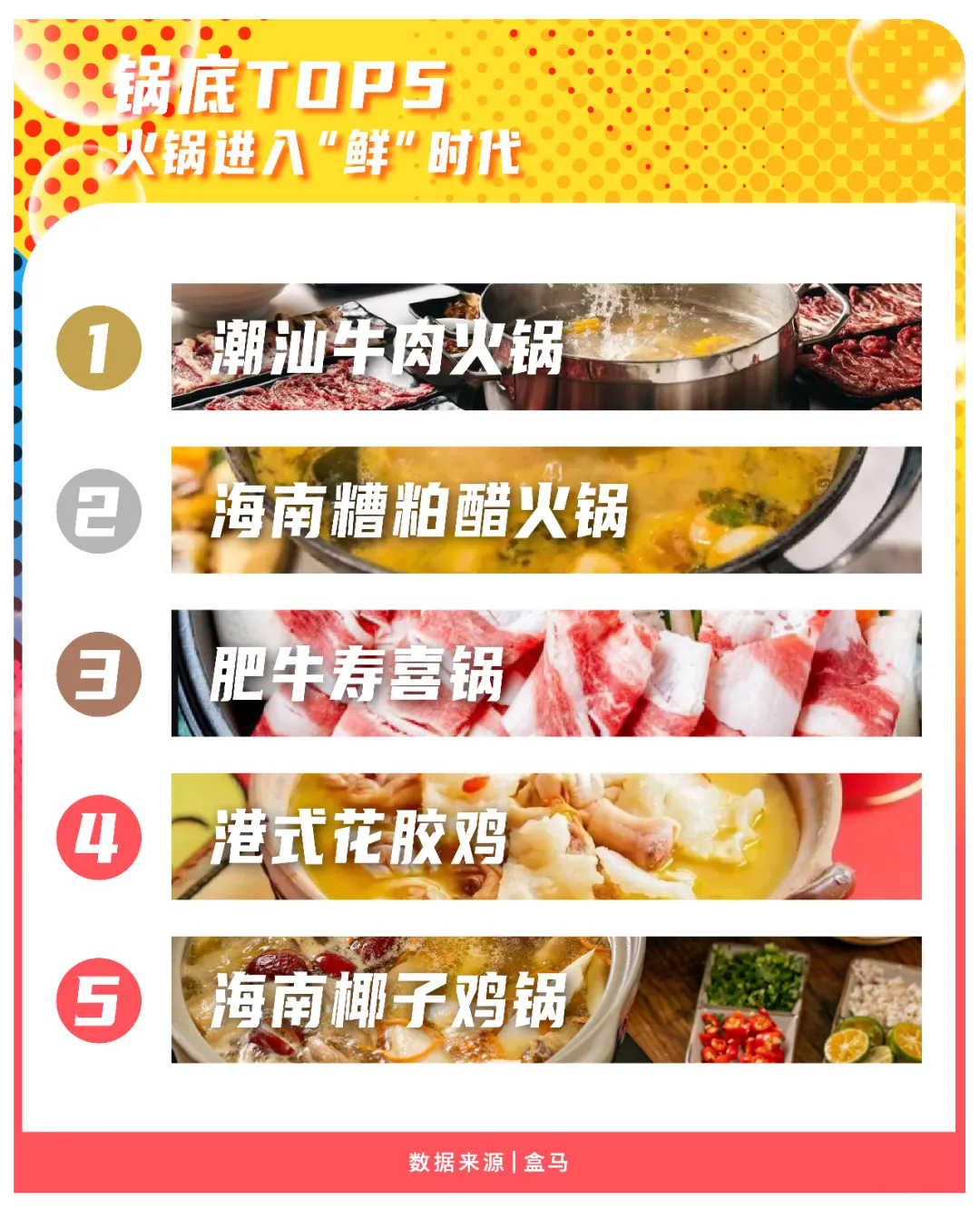 盒马提供的锅底消费数据则更直观地展现这一点,糟粕醋火锅仅次于初代以鲜闻名的“网红”潮汕牛肉清汤锅,销量排名第二,与此同时,主打鲜味更清淡的肥牛寿喜锅、椰子鸡火锅等也越来越受欢迎。