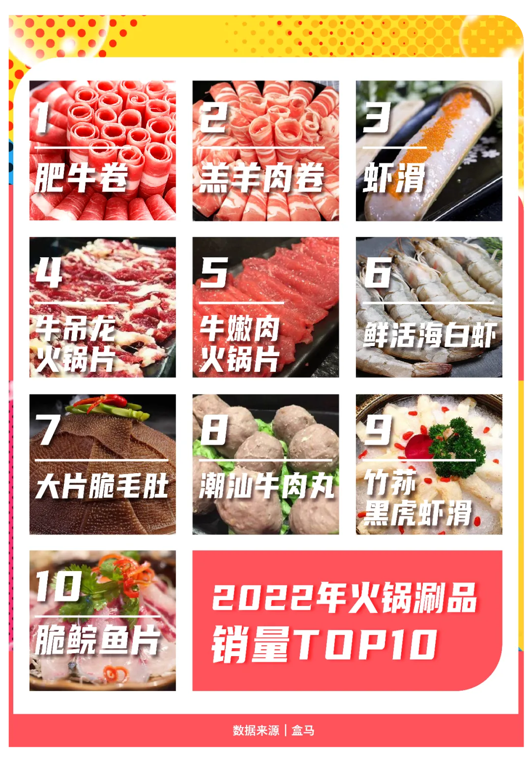 各种数据显示,相比于涮冷冻涮品,鲜肉越来越成为消费者的主流选择,销售额正逐步逼近冻品。从最受线上消费者欢迎的涮品数据来看,口感嫩滑的新鲜牛吊龙和牛嫩肉销量跻身榜单前五,仅次于火锅经典三件套——肥牛、羔羊肉卷、虾滑。