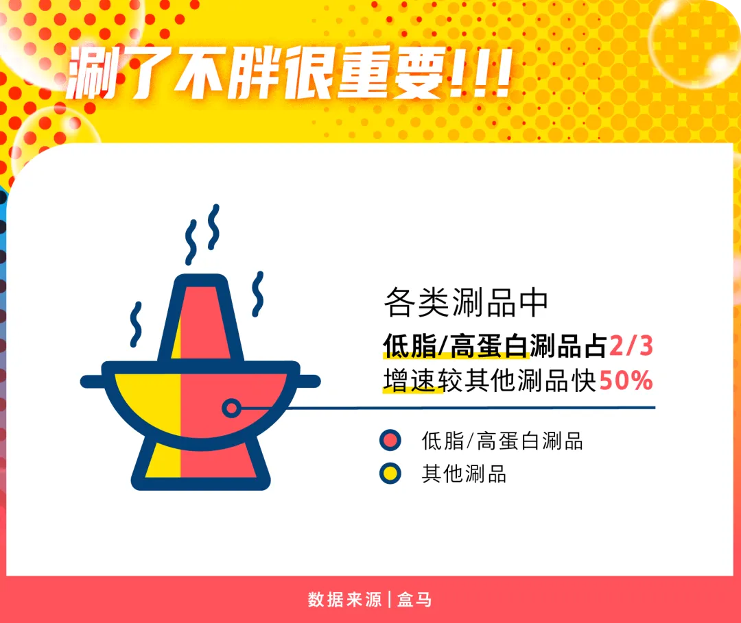 在小红书上搜“减脂火锅”,相关的笔记超过33万条。其中一部分笔记内容,就是安利大家把牛肉、鸡肉、鱼肉这类低脂高蛋白食物当作“减脂”涮品的。在大家的安利中,不论是健身人群,还是想减肥但又馋嘴的年轻人,都可以大胆尝试。盒马数据显示,肉禽类涮品中,低脂/高蛋白涮品占全部的2/3,增速较其他涮品快50%。