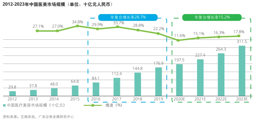 在中国,随着国民可支配收入的稳步提高,在消费升级和新型数字媒体营销带来的消费者意识增强的双重影响下,消费者对医美的接受程度逐渐提高,医美行业需求加速释放,中国医美市场在过去的几年里增幅显著。在医美市场规模持续扩大的同时,政府不断出台政策支持医美行业的规范化。医美行业监管环境逐渐趋严,加速了行业洗牌。在经历投融资高峰期后,资本市场进一步推动行业加速整合。