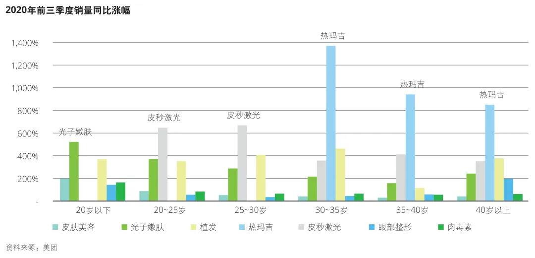 北京、上海医美消费额领先全国,南方热度高于北方。20-35岁女性为消费主力军,熟龄女性消费水平更高。脱毛、祛痘、光子嫩肤、皮秒激光、热玛吉等皮肤管理及抗衰老管理类项目热度递增。