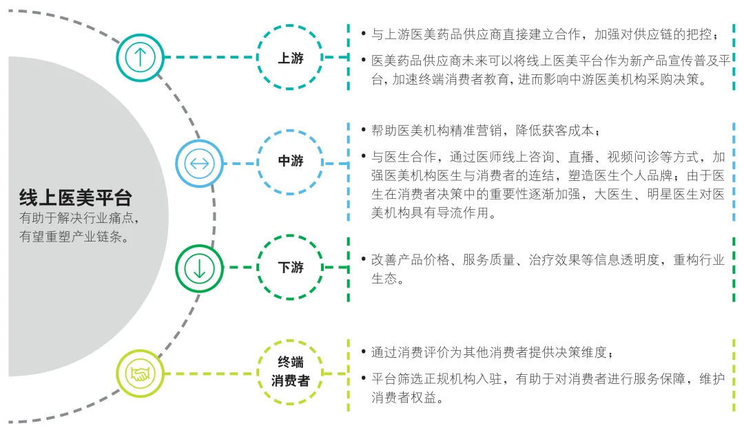 互联网介入医美行业在一定程度上改善了医美机构获客成本高、信息不透明导致消费者决策困难等问题。通过将上游供应商纳入医美线上生态体系,未来可实现产业链上中下游整合。