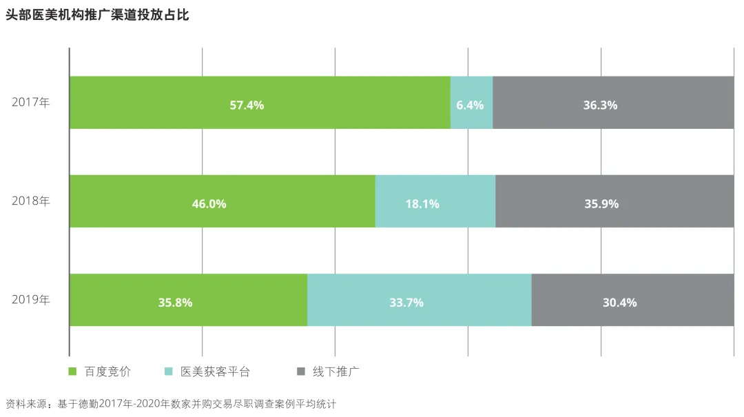 早期医美机构获客渠道以传统广告、搜索引擎(百度)为主,投放方式粗放单一,投产比逐年下滑。而各类医美获客平台(如美团医美、新氧、天猫医美等)由于营销精准度较高,因此投产比连年上升。