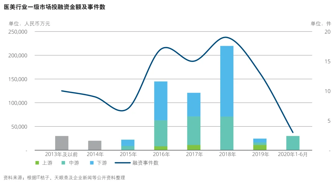 2016年至2018年医美行业迎来投融资高峰。据不完全统计,2018年共发生约19起融资事件,融资金额达人民币22亿元。受监管加强、资本降温影响,2019年融资总金额约为人民币2.5亿元,同比下降89%。在过去几年的快速发展期内,医美产业链中下游环节特别是下游环节成为创业风口。